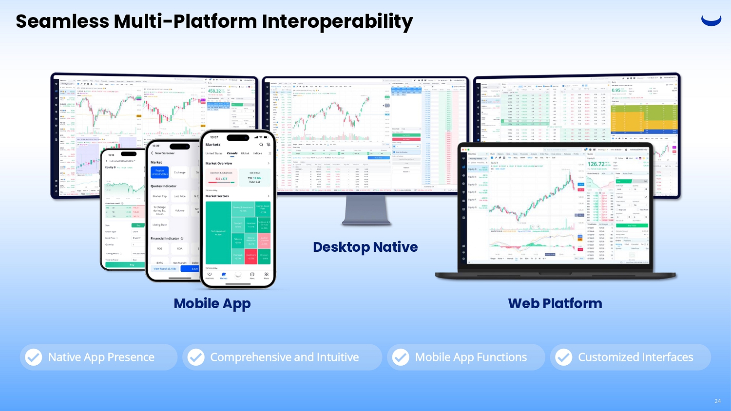 Seamless Multi - Platform Interoperability Mobile App Desktop Native Native App Presence Comprehensive and Intuitive Mobile App Functions Customized Interfaces Web Platform 24