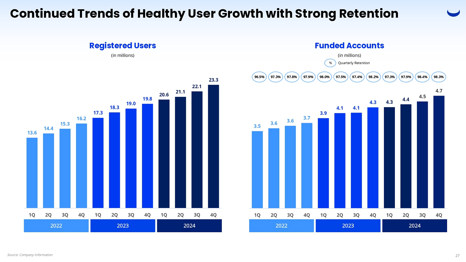 3.5 3.6 3.6 3.7 3.9 4.1 4.1 4.3 4.3 4.4 4.5 4.7 1Q 2Q 3Q 4Q 1Q 2Q 3Q 4Q 1Q 2Q 3Q 4Q 96.5% 97.3% 98.0% 97.8% 98.2% 97.5% 97.4% 97.9% 97.3% 97.9% 98.4% Continued Trends of Healthy User Growth with Strong Retention Registered Users (in millions) Funded Accounts (in millions) % Quarterly Retention 2022 2023 2024 13.6 14.4 15.3 16.2 17.3 18.3 19.0 19.8 20.6 21.1 22.1 23.3 1Q 2Q 3Q 4Q 1Q 2Q 3Q 4Q 1Q 2Q 3Q 4Q 98.3% Source: Company Information 27 2022 2023 2024