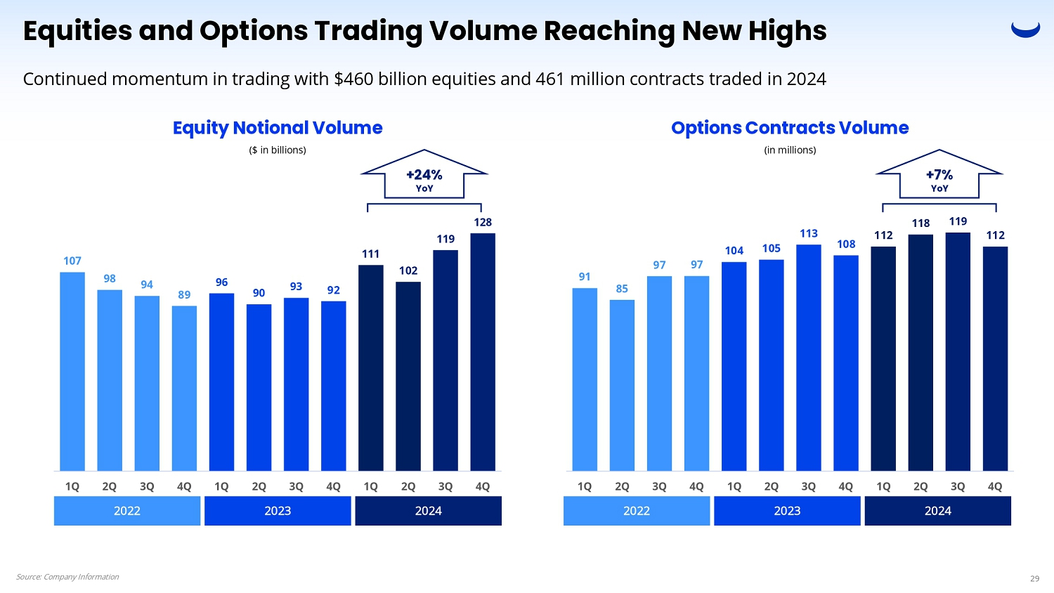 107 98 94 89 96 90 93 92 111 102 119 128 1Q 2Q 3Q 4Q 1Q 2Q 3Q 4Q 1Q 2Q 3Q 4Q Equity Notional Volume ($ in billions) Equities and Options Trading Volume Reaching New Highs Continued momentum in trading with $460 billion equities and 461 million contracts traded in 2024 Options Contracts Volume (in millions) +24% YoY +7% YoY 2022 2023 2024 2022 2023 2024 91 Source: Company Information 29 85 97 97 104 105 113 108 112 118 119 112 1Q 2Q 3Q 4Q 1Q 2Q 3Q 4Q 1Q 2Q 3Q 4Q