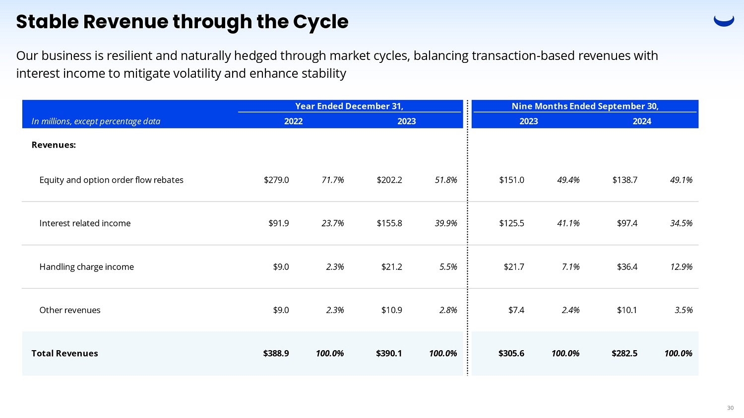 Stable Revenue through the Cycle Our business is resilient and naturally hedged through market cycles, balancing transaction - based revenues with interest income to mitigate volatility and enhance stability Nine Months Ended September 30, 2023 2024 $151.0 49.4% $138.7 49.1% Year Ended December 31, 2022 2023 In millions, except percentage data Revenues: $279.0 71.7% $202.2 51.8% Equity and option order flow rebates 34.5% $97.4 41.1% $125.5 39.9% $155.8 23.7% $91.9 Interest related income 12.9% $36.4 7.1% $21.7 5.5% $21.2 2.3% $9.0 Handling charge income 3.5% $10.1 2.4% $7.4 2.8% $10.9 2.3% $9.0 Other revenues 100.0% $282.5 100.0% $305.6 100.0% $390.1 100.0% $388.9 Total Revenues 30