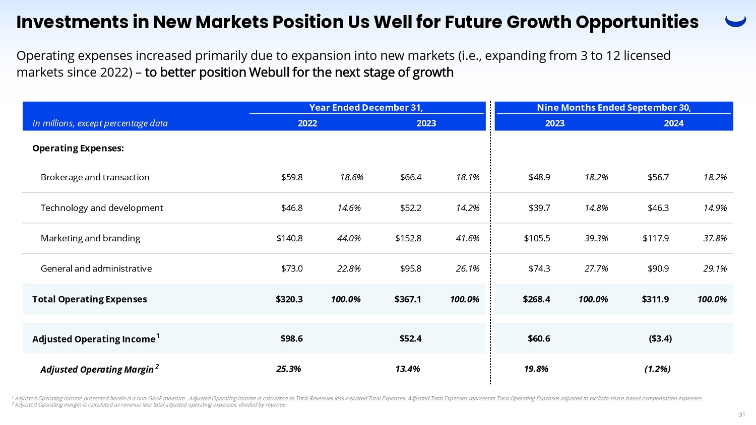 Investments in New Markets Position Us Well for Future Growth Opportunities Operating expenses increased primarily due to expansion into new markets (i.e., expanding from 3 to 12 licensed markets since 2022) – to better position Webull for the next stage of growth 1 Adjusted Operating Income presented herein is a non - GAAP measure. Adjusted Operating Income is calculated as Total Revenues less Adjusted Total Expenses. Adjusted Total Expenses represents Total Operating Expenses adjusted to exclude share - based compensation expenses 2 Adjusted Operating margin is calculated as revenue less total adjusted operating expenses, divided by revenue Nine Months Ended September 30, 2023 2024 $48.9 18.2% $56.7 18.2% Year Ended December 31, 2022 2023 In millions, except percentage data Operating Expenses: $59.8 18.6% $66.4 18.1% Brokerage and transaction 14.9% $46.3 14.8% $39.7 14.2% $52.2 14.6% $46.8 Technology and development 37.8% $117.9 39.3% $105.5 41.6% $152.8 44.0% $140.8 Marketing and branding 29.1% $90.9 27.7% $74.3 26.1% $95.8 22.8% $73.0 General and administrative 100.0% $311.9 100.0% $268.4 100.0% $367.1 100.0% $320.3 Total Operating Expenses ($3.4) $60.6 $52.4 $98.6 Adjusted Operating Income 1 (1.2%) 19.8% 13.4% 25.3% Adjusted Operating Margin 2 31