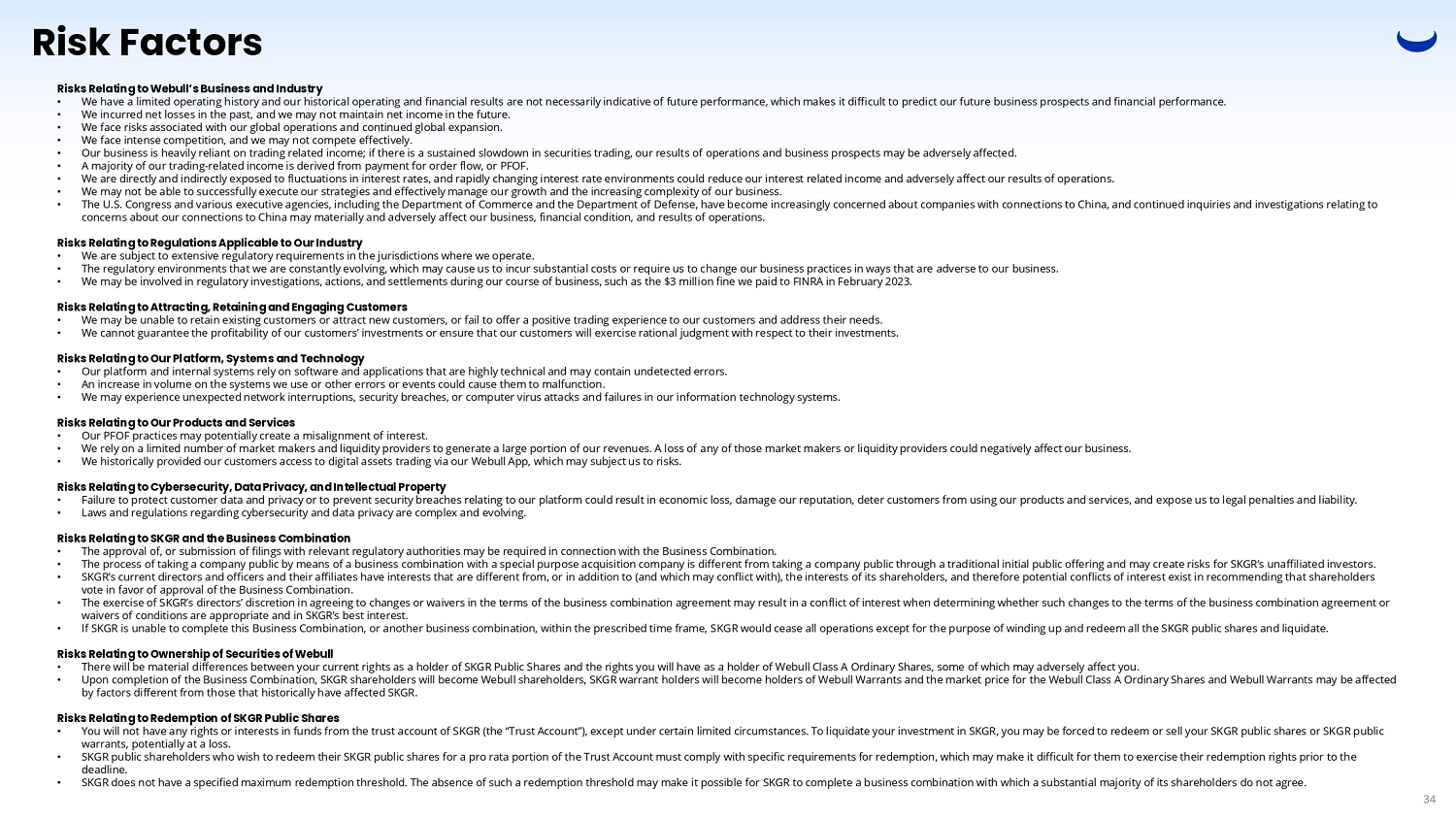 Risk Factors Risks Relating to Webull’s Business and Industry • We have a limited operating history and our historical operating and financial results are not necessarily indicative of future performance, which makes it difficult to predict our future business prospects and financial performance. • We incurred net losses in the past, and we may not maintain net income in the future. • We face risks associated with our global operations and continued global expansion. • We face intense competition, and we may not compete effectively. • Our business is heavily reliant on trading related income; if there is a sustained slowdown in securities trading, our results of operations and business prospects may be adversely affected. • A majority of our trading - related income is derived from payment for order flow, or PFOF. • We are directly and indirectly exposed to fluctuations in interest rates, and rapidly changing interest rate environments could reduce our interest related income and adversely affect our results of operations. • We may not be able to successfully execute our strategies and effectively manage our growth and the increasing complexity of our business. • The U.S. Congress and various executive agencies, including the Department of Commerce and the Department of Defense, have become increasingly concerned about companies with connections to China, and continued inquiries and investigations relating to concerns about our connections to China may materially and adversely affect our business, financial condition, and results of operations. Risks Relating to Regulations Applicable to Our Industry • We are subject to extensive regulatory requirements in the jurisdictions where we operate. • The regulatory environments that we are constantly evolving, which may cause us to incur substantial costs or require us to change our business practices in ways that are adverse to our business. • We may be involved in regulatory investigations, actions, and settlements during our course of business, such as the $3 million fine we paid to FINRA in February 2023. Risks Relating to Attracting, Retaining and Engaging Customers • We may be unable to retain existing customers or attract new customers, or fail to offer a positive trading experience to our customers and address their needs. • We cannot guarantee the profitability of our customers’ investments or ensure that our customers will exercise rational judgment with respect to their investments. Risks Relating to Our Platform, Systems and Technology • Our platform and internal systems rely on software and applications that are highly technical and may contain undetected errors. • An increase in volume on the systems we use or other errors or events could cause them to malfunction. • We may experience unexpected network interruptions, security breaches, or computer virus attacks and failures in our information technology systems. Risks Relating to Our Products and Services • Our PFOF practices may potentially create a misalignment of interest. • We rely on a limited number of market makers and liquidity providers to generate a large portion of our revenues. A loss of any of those market makers or liquidity providers could negatively affect our business. • We historically provided our customers access to digital assets trading via our Webull App, which may subject us to risks. Risks Relating to Cybersecurity, Data Privacy, and Intellectual Property • Failure to protect customer data and privacy or to prevent security breaches relating to our platform could result in economic loss, damage our reputation, deter customers from using our products and services, and expose us to legal penalties and liability. • Laws and regulations regarding cybersecurity and data privacy are complex and evolving. Risks Relating to SKGR and the Business Combination • The approval of, or submission of filings with relevant regulatory authorities may be required in connection with the Business Combination. • The process of taking a company public by means of a business combination with a special purpose acquisition company is different from taking a company public through a traditional initial public offering and may create risks for SKGR’s unaffiliated investors. • SKGR’s current directors and officers and their affiliates have interests that are different from, or in addition to (and which may conflict with), the interests of its shareholders, and therefore potential conflicts of interest exist in recommending that shareholders vote in favor of approval of the Business Combination. • The exercise of SKGR’s directors’ discretion in agreeing to changes or waivers in the terms of the business combination agreement may result in a conflict of interest when determining whether such changes to the terms of the business combination agreement or waivers of conditions are appropriate and in SKGR’s best interest. • If SKGR is unable to complete this Business Combination, or another business combination, within the prescribed time frame, SKGR would cease all operations except for the purpose of winding up and redeem all the SKGR public shares and liquidate. Risks Relating to Ownership of Securities of Webull • There will be material differences between your current rights as a holder of SKGR Public Shares and the rights you will have as a holder of Webull Class A Ordinary Shares, some of which may adversely affect you. • Upon completion of the Business Combination, SKGR shareholders will become Webull shareholders, SKGR warrant holders will become holders of Webull Warrants and the market price for the Webull Class A Ordinary Shares and Webull Warrants may be affected by factors different from those that historically have affected SKGR. Risks Relating to Redemption of SKGR Public Shares • You will not have any rights or interests in funds from the trust account of SKGR (the “Trust Account”), except under 