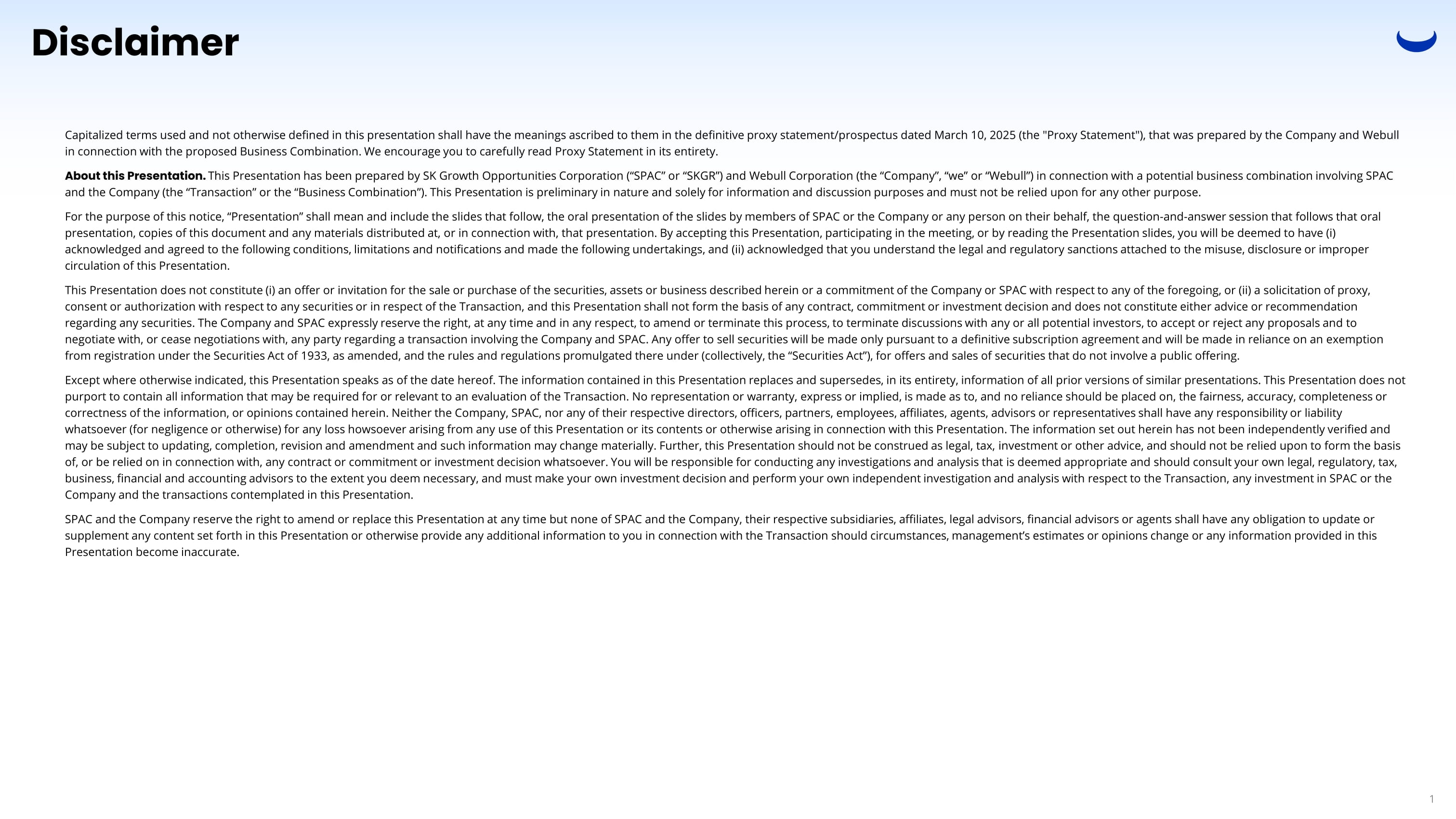 Disclaimer Capitalized terms used and not otherwise defined in this presentation shall have the meanings ascribed to them in the definit ive proxy statement/prospectus dated March 10, 2025 (the "Proxy Statement"), that was prepared by the Company and Webull in connection with the proposed Business Combination. We encourage you to carefully read Proxy Statement in its entirety. About this Presentation. This Presentation has been prepared by SK Growth Opportunities Corporation (“SPAC” or “SKGR”) and Webull Corporation (the “Co mpa ny”, “we” or “Webull”) in connection with a potential business combination involving SPAC and the Company (the “Transaction” or the “Business Combination”). This Presentation is preliminary in nature and solely for inf ormation and discussion purposes and must not be relied upon for any other purpose. For the purpose of this notice, “Presentation” shall mean and include the slides that follow, the oral presentation of the sl ide s by members of SPAC or the Company or any person on their behalf, the question - and - answer session that follows that oral presentation, copies of this document and any materials distributed at, or in connection with, that presentation. By acceptin g t his Presentation, participating in the meeting, or by reading the Presentation slides, you will be deemed to have (i) acknowledged and agreed to the following conditions, limitations and notifications and made the following undertakings, and ( ii) acknowledged that you understand the legal and regulatory sanctions attached to the misuse, disclosure or improper circulation of this Presentation. This Presentation does not constitute (i) an offer or invitation for the sale or purchase of the securities, assets or busine ss described herein or a commitment of the Company or SPAC with respect to any of the foregoing, or (ii) a solicitation of proxy , consent or authorization with respect to any securities or in respect of the Transaction, and this Presentation shall not for m t he basis of any contract, commitment or investment decision and does not constitute either advice or recommendation regarding any securities. The Company and SPAC expressly reserve the right, at any time and in any respect, to amend or termi nat e this process, to terminate discussions with any or all potential investors, to accept or reject any proposals and to negotiate with, or cease negotiations with, any party regarding a transaction involving the Company and SPAC. Any offer to se ll securities will be made only pursuant to a definitive subscription agreement and will be made in reliance on an exemption from registration under the Securities Act of 1933, as amended, and the rules and regulations promulgated there under (collec tiv ely, the “Securities Act”), for offers and sales of securities that do not involve a public offering. Except where otherwise indicated, this Presentation speaks as of the date hereof. The information contained in this Presentat ion replaces and supersedes, in its entirety, information of all prior versions of similar presentations. This Presentation does no t purport to contain all information that may be required for or relevant to an evaluation of the Transaction. No representatio n o r warranty, express or implied, is made as to, and no reliance should be placed on, the fairness, accuracy, completeness or correctness of the information, or opinions contained herein. Neither the Company, SPAC, nor any of their respective director s, officers, partners, employees, affiliates, agents, advisors or representatives shall have any responsibility or liability whatsoever (for negligence or otherwise) for any loss howsoever arising from any use of this Presentation or its contents or oth erwise arising in connection with this Presentation. The information set out herein has not been independently verified and may be subject to updating, completion, revision and amendment and such information may change materially. Further, this Pres ent ation should not be construed as legal, tax, investment or other advice, and should not be relied upon to form the basis of, or be relied on in connection with, any contract or commitment or investment decision whatsoever. You will be responsible fo r conducting any investigations and analysis that is deemed appropriate and should consult your own legal, regulatory, tax, business, financial and accounting advisors to the extent you deem necessary, and must make your own investment decision and per form your own independent investigation and analysis with respect to the Transaction, any investment in SPAC or the Company and the transactions contemplated in this Presentation. SPAC and the Company reserve the right to amend or replace this Presentation at any time but none of SPAC and the Company, th eir respective subsidiaries, affiliates, legal advisors, financial advisors or agents shall have any obligation to update or supplement any content set forth in this Presentation or otherwise provide any additional information to you in connection wi th the Transaction should circumstances, management’s estimates or opinions change or any information provided in this Presentation become inaccurate. 1