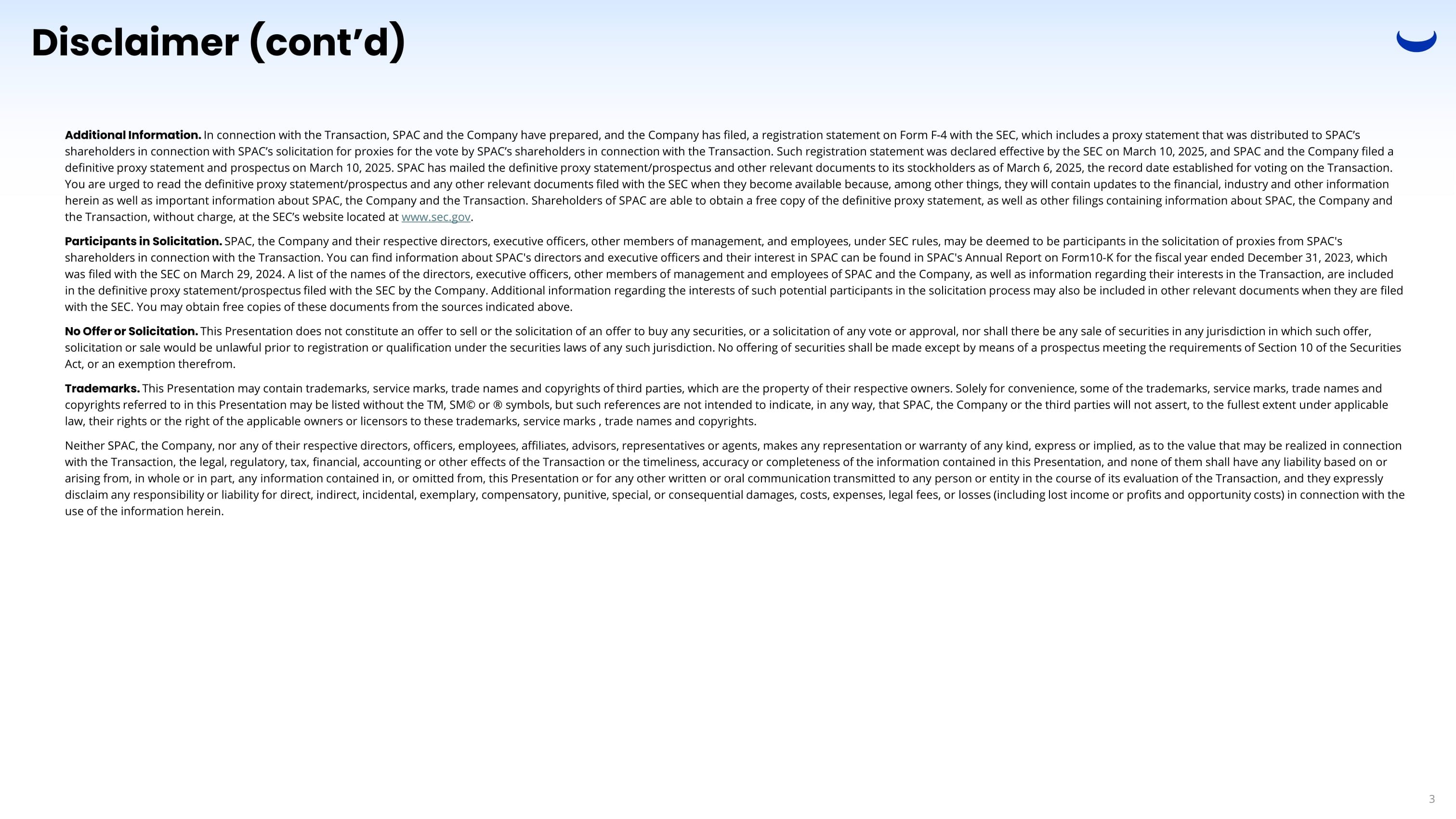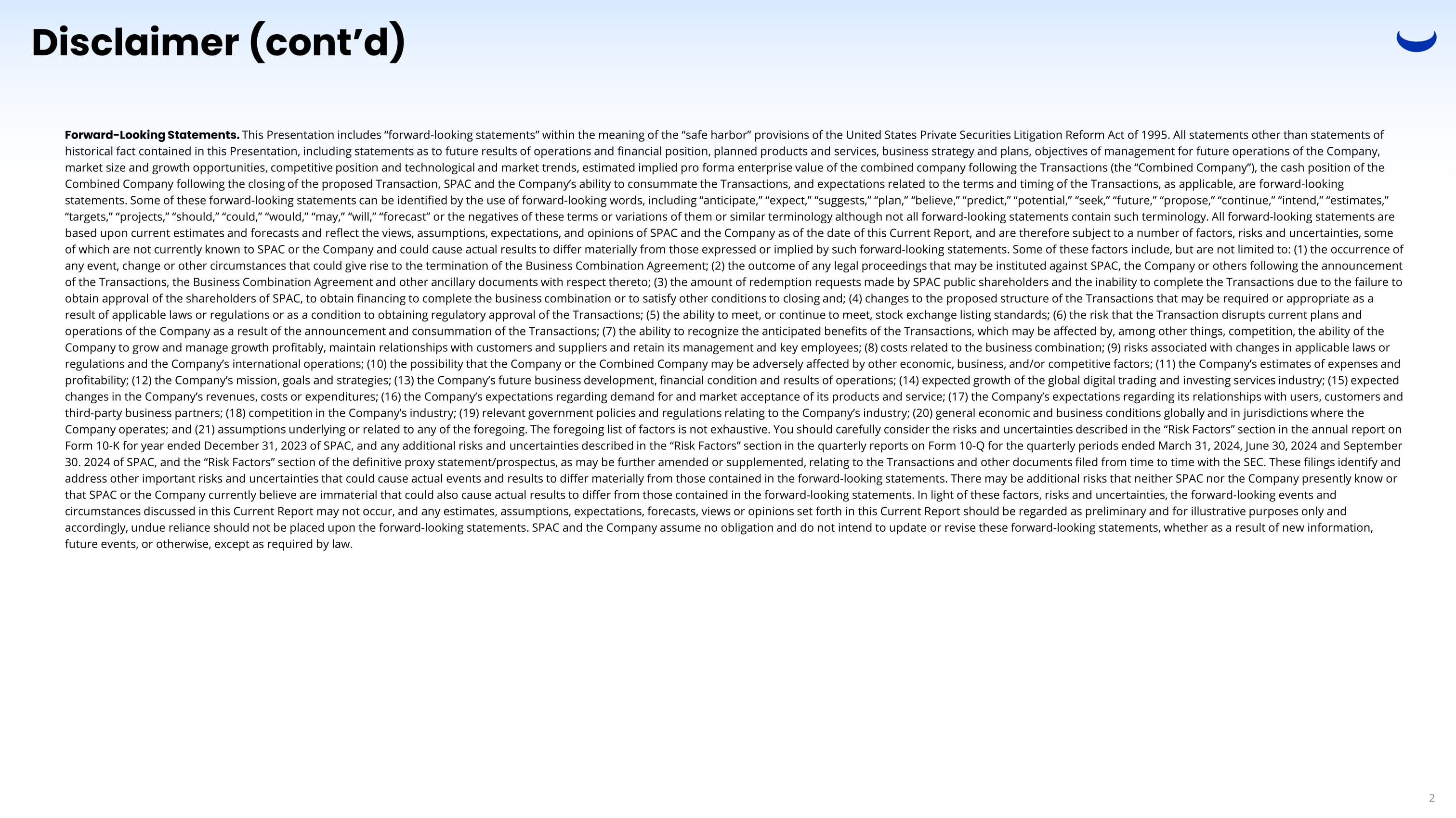 Disclaimer (cont’d) Forward - Looking Statements. This Presentation includes “forward - looking statements” within the meaning of the “safe harbor” provisions of the United States Private Securities Litigation Reform Act of 1995. All statements other than statements of historical fact contained in this Presentation, including statements as to future results of operations and financial positio n, planned products and services, business strategy and plans, objectives of management for future operations of the Company, market size and growth opportunities, competitive position and technological and market trends, estimated implied pro forma e nte rprise value of the combined company following the Transactions (the “Combined Company”), the cash position of the Combined Company following the closing of the proposed Transaction, SPAC and the Company’s ability to consummate the Transact ion s, and expectations related to the terms and timing of the Transactions, as applicable, are forward - looking statements. Some of these forward - looking statements can be identified by the use of forward - looking words, including “anticipat e,” “expect,” “suggests,” “plan,” “believe,” “predict,” “potential,” “seek,” “future,” “propose,” “continue,” “intend,” “esti mat es,” “targets,” “projects,” “should,” “could,” “would,” “may,” “will,” “forecast” or the negatives of these terms or variations of th em or similar terminology although not all forward - looking statements contain such terminology. All forward - looking statements a re based upon current estimates and forecasts and reflect the views, assumptions, expectations, and opinions of SPAC and the Com pan y as of the date of this Current Report, and are therefore subject to a number of factors, risks and uncertainties, some of which are not currently known to SPAC or the Company and could cause actual results to differ materially from those expres sed or implied by such forward - looking statements. Some of these factors include, but are not limited to: (1) the occurrence of any event, change or other circumstances that could give rise to the termination of the Business Combination Agreement; (2) t he outcome of any legal proceedings that may be instituted against SPAC, the Company or others following the announcement of the Transactions, the Business Combination Agreement and other ancillary documents with respect thereto; (3) the amount of re demption requests made by SPAC public shareholders and the inability to complete the Transactions due to the failure to obtain approval of the shareholders of SPAC, to obtain financing to complete the business combination or to satisfy other con dit ions to closing and; (4) changes to the proposed structure of the Transactions that may be required or appropriate as a result of applicable laws or regulations or as a condition to obtaining regulatory approval of the Transactions; (5) the abil ity to meet, or continue to meet, stock exchange listing standards; (6) the risk that the Transaction disrupts current plans and operations of the Company as a result of the announcement and consummation of the Transactions; (7) the ability to recognize the anticipated benefits of the Transactions, which may be affected by, among other things, competition, the ability of the Company to grow and manage growth profitably, maintain relationships with customers and suppliers and retain its management a nd key employees; (8) costs related to the business combination; (9) risks associated with changes in applicable laws or regulations and the Company’s international operations; (10) the possibility that the Company or the Combined Company may be adv ersely affected by other economic, business, and/or competitive factors; (11) the Company’s estimates of expenses and profitability; (12) the Company’s mission, goals and strategies; (13) the Company’s future business development, financial co ndi tion and results of operations; (14) expected growth of the global digital trading and investing services industry; (15) expe cte d changes in the Company’s revenues, costs or expenditures; (16) the Company’s expectations regarding demand for and market acc ept ance of its products and service; (17) the Company’s expectations regarding its relationships with users, customers and third - party business partners; (18) competition in the Company’s industry; (19) relevant government policies and regulations rel ating to the Company’s industry; (20) general economic and business conditions globally and in jurisdictions where the Company operates; and (21) assumptions underlying or related to any of the foregoing. The foregoing list of factors is not ex hau stive. You should carefully consider the risks and uncertainties described in the “Risk Factors” section in the annual report on Form 10 - K for year ended December 31, 2023 of SPAC, and any additional risks and uncertainties described in the “Risk Factors” s ection in the quarterly reports on Form 10 - Q for the quarterly periods ended March 31, 2024, June 30, 2024 and September 30. 2024 of SPAC, and the “Risk Factors” section of the definitive proxy statement/prospectus, as may be further amended or s upp lemented, relating to the Transactions and other documents filed from time to time with the SEC. These filings identify and address other important risks and uncertainties that could cause actual events and results to differ materially from those co nta ined in the forward - looking statements. There may be additional risks that neither SPAC nor the Company presently know or that SPAC or the Company currently believe are immaterial that could also cause actual results to differ from those contained in the forward - looking statements. In light of these factors, risks and uncertainties, the forward - looking events and circumstances discussed in this Current Report 