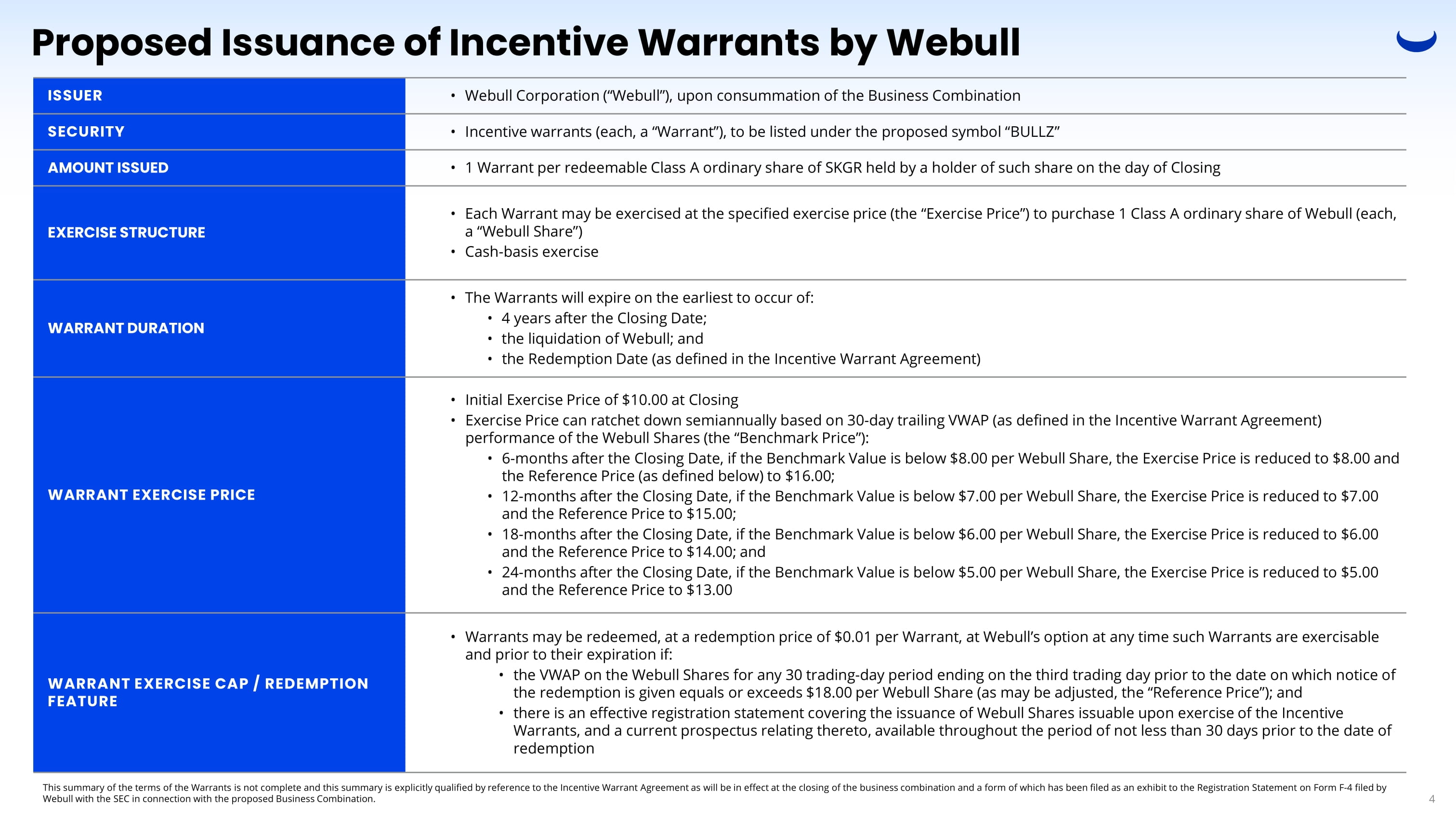 Proposed Issuance of Incentive Warrants by Webull 4 • Webull Corporation (“ Webull ”), upon consummation of the Business Combination ISSUER • Incentive warrants (each, a “Warrant”), to be listed under the proposed symbol “BULLZ” SECURITY • 1 Warrant per redeemable Class A ordinary share of SKGR held by a holder of such share on the day of Closing AMOUNT ISSUED • Each Warrant may be exercised at the specified exercise price (the “Exercise Price”) to purchase 1 Class A ordinary share of Webull (each, a “ Webull Share”) • Cash - basis exercise EXERCISE STRUCTURE • The Warrants will expire on the earliest to occur of: • 4 years after the Closing Date; • the liquidation of Webull ; and • the Redemption Date (as defined in the Incentive Warrant Agreement) WARRANT DURATION • Initial Exercise Price of $10.00 at Closing • Exercise Price can ratchet down semiannually based on 30 - day trailing VWAP (as defined in the Incentive Warrant Agreement) performance of the Webull Shares (the “Benchmark Price”): • 6 - months after the Closing Date, if the Benchmark Value is below $8.00 per Webull Share, the Exercise Price is reduced to $8.00 and the Reference Price (as defined below) to $16.00; • 12 - months after the Closing Date, if the Benchmark Value is below $7.00 per Webull Share, the Exercise Price is reduced to $7.00 and the Reference Price to $15.00; • 18 - months after the Closing Date, if the Benchmark Value is below $6.00 per Webull Share, the Exercise Price is reduced to $6.00 and the Reference Price to $14.00; and • 24 - months after the Closing Date, if the Benchmark Value is below $5.00 per Webull Share, the Exercise Price is reduced to $5.00 and the Reference Price to $13.00 WARRANT EXERCISE PRICE • Warrants may be redeemed, at a redemption price of $0.01 per Warrant, at Webull’s option at any time such Warrants are exercisable and prior to their expiration if: • the VWAP on the Webull Shares for any 30 trading - day period ending on the third trading day prior to the date on which notice of the redemption is given equals or exceeds $18.00 per Webull Share (as may be adjusted, the “Reference Price”); and • there is an effective registration statement covering the issuance of Webull Shares issuable upon exercise of the Incentive Warrants, and a current prospectus relating thereto, available throughout the period of not less than 30 days prior to the da te of redemption WARRANT EXERCISE CAP / REDEMPTION FEATURE This summary of the terms of the Warrants is not complete and this summary is explicitly qualified by reference to the Incent ive Warrant Agreement as will be in effect at the closing of the business combination and a form of which has been filed as an ex hi bit to the Registration Statement on Form F - 4 filed by Webull with the SEC in connection with the proposed Business Combination.