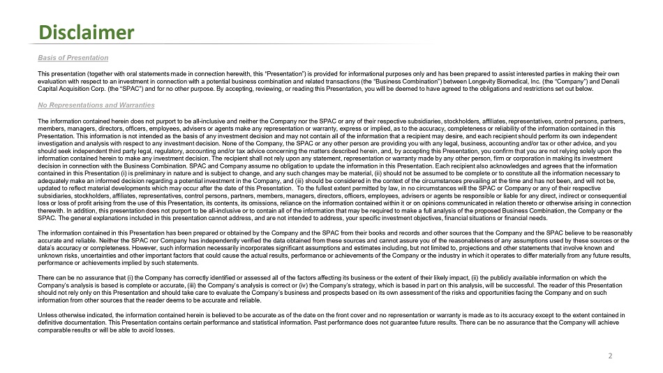 Disclaimer 2 Basis of Presentation This presentation (together with oral statements made in connection herewith, this “Presentation”) is provided for informatio nal purposes only and has been prepared to assist interested parties in making their own evaluation with respect to an investment in connection with a potential business combination and related transactions (the “B usi ness Combination”) between Longevity Biomedical, Inc. (the “Company”) and Denali Capital Acquisition Corp. (the “SPAC”) and for no other purpose. By accepting, reviewing, or reading this Presentation, you w ill be deemed to have agreed to the obligations and restrictions set out below. No Representations and Warranties The information contained herein does not purport to be all - inclusive and neither the Company nor the SPAC or any of their respe ctive subsidiaries, stockholders, affiliates, representatives, control persons, partners, members, managers, directors, officers, employees, advisers or agents make any representation or warranty, express or implied , a s to the accuracy, completeness or reliability of the information contained in this Presentation. This information is not intended as the basis of any investment decision and may not contain all of the informa tio n that a recipient may desire, and each recipient should perform its own independent investigation and analysis with respect to any investment decision. None of the Company, the SPAC or any other person are pro vid ing you with any legal, business, accounting and/or tax or other advice, and you should seek independent third party legal, regulatory, accounting and/or tax advice concerning the matters described herein, and , by accepting this Presentation, you confirm that you are not relying solely upon the information contained herein to make any investment decision. The recipient shall not rely upon any statement, representation or warranty made by any other person, firm or corporation in making its investment decision in connection with the Business Combination. SPAC and Company assume no obligation to update the information in this Pr esentation. Each recipient also acknowledges and agrees that the information contained in this Presentation ( i ) is preliminary in nature and is subject to change, and any such changes may be material, (ii) should not be assumed to be c omp lete or to constitute all the information necessary to adequately make an informed decision regarding a potential investment in the Company, and (iii) should be considered in the c ont ext of the circumstances prevailing at the time and has not been, and will not be, updated to reflect material developments which may occur after the date of this Presentation. To the fullest extent permitte d b y law, in no circumstances will the SPAC or Company or any of their respective subsidiaries, stockholders, affiliates, representatives, control persons, partners, members, managers, directors, officers, e mpl oyees, advisers or agents be responsible or liable for any direct, indirect or consequential loss or loss of profit arising from the use of this Presentation, its contents, its omissions, reliance on the information co nta ined within it or on opinions communicated in relation thereto or otherwise arising in connection therewith. In addition, this presentation does not purport to be all - inclusive or to contain all of the information that may be required to make a full analysis of the proposed Business Combination, the Company or the SPAC. The general explanations included in this presentation cannot address, and are not intended to address, your specific i nve stment objectives, financial situations or financial needs. The information contained in this Presentation has been prepared or obtained by the Company and the SPAC from their books and re cords and other sources that the Company and the SPAC believe to be reasonably accurate and reliable. Neither the SPAC nor Company has independently verified the data obtained from these sources and canno t a ssure you of the reasonableness of any assumptions used by these sources or the data’s accuracy or completeness. However, such information necessarily incorporates significant assumptions and estimates inc lud ing, but not limited to, projections and other statements that involve known and unknown risks, uncertainties and other important factors that could cause the actual results, performance or achievements of the Company or the industry in which it operates to differ materially from any future results, performance or achievements implied by such statements. There can be no assurance that ( i ) the Company has correctly identified or assessed all of the factors affecting its business or the extent of their likely im pac t, (ii) the publicly available information on which the Company’s analysis is based is complete or accurate, (iii) the Company’s analysis is correct or (iv) the Company’s strategy, whi ch is based in part on this analysis, will be successful. The reader of this Presentation should not rely only on this Presentation and should take care to evaluate the Company’s business and prospects based on its own assessment of the risks and opportunities facing the Company and on such information from other sources that the reader deems to be accurate and reliable. Unless otherwise indicated, the information contained herein is believed to be accurate as of the date on the front cover and no representation or warranty is made as to its accuracy except to the extent contained in definitive documentation. This Presentation contains certain performance and statistical information. Past performance does n ot guarantee future results. There can be no assurance that the Company will achieve comparable results or will be able to avoid losses.