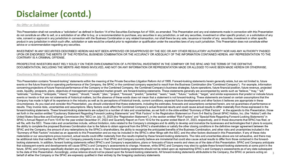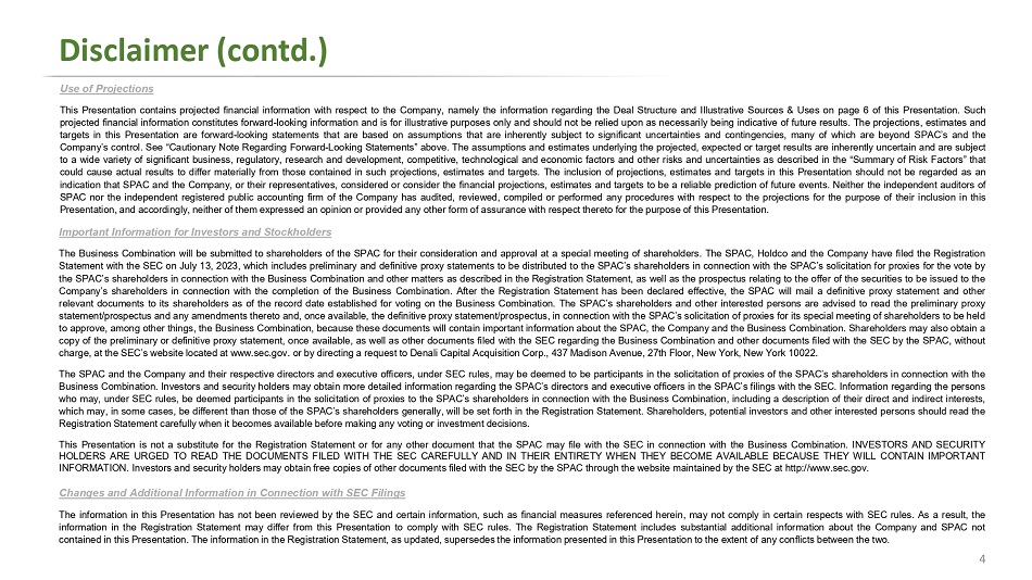 Disclaimer (contd.) 3 No Offer or Solicitation This Presentation shall not constitute a “solicitation” as defined in Section 14 of the Securities Exchange Act of 1934, as a men ded. This Presentation and any oral statements made in connection with this Presentation do not constitute an offer to sell, or a solicitation of an offer to buy, or a recommendation to purchase, any securities in any jurisdiction, or sell any securities, investment or other specific product, or a solicitation of any vote, consent or approval in any jurisdiction in connection with the Business Combination or any related transaction, nor sha ll there be any sale, issuance or transfer of any securities, investment or other specific product in any jurisdiction in which such offer, solicitation or sale would be unlawful prior to registration or qualificatio n u nder the securities laws of any such jurisdiction. This Presentation does not constitute either advice or a recommendation regarding any securities. INVESTMENT IN ANY SECURITIES DESCRIBED HEREIN HAS NOT BEEN APPROVED OR DISAPPROVED BY THE SEC OR ANY OTHER REGULATORY AUTHORI TY NOR HAS ANY AUTHORITY PASSED UPON OR ENDORSED THE MERITS OF THE POTENTIAL BUSINESS COMBINATION OR THE ACCURACY OR ADEQUACY OF THE INFORMATION CONTAINED HE REI N. ANY REPRESENTATION TO THE CONTRARY IS A CRIMINAL OFFENSE. PROSPECTIVE INVESTORS MUST RELY SOLELY ON THEIR OWN EXAMINATION OF A POTENTIAL INVESTMENT IN THE COMPANY OR THE SPAC AND THE TER MS OF THE DEFINITIVE DOCUMENTATION, INCLUDING THE MERITS AND RISKS INVOLVED, AND NOT ON ANY INFORMATION OR REPRESENTATION MADE OR ALLEGED TO HAVE BEE N MADE HEREIN OR OTHERWISE. Cautionary Note Regarding Forward - Looking Statements This Presentation contains “forward - looking” statements within the meaning of the Private Securities Litigation Reform Act of 19 95. Forward - looking statements herein generally relate, but are not limited to, future events or the future financial or operating performance of the Company, the SPAC or the combined company expected to result f rom the Business Combination (the “Combined Company”). For example, information concerning projections of future financial performance of the Company or the Combined Company, the Combined Company’s busines s s trategies, future operations, future financial position, future revenue, projected costs, liquidity, prospects, plans, objectives of management and expected market growth are forward - looking statements. These s tatements generally are accompanied by words such as “believe,” “may,” “will,” “estimate,” “continue,” “anticipate,” “intend,” “expect,” “should,” “would,” “plan,” “project,” “forecast,” “predict,” “poten tia l,” “seem,” “seek,” “future,” “outlook,” “target,” and similar expressions that predict or indicate future events or trends or that are not statements of historical matters, but the absence of these words does not mean that a statem ent is not forward - looking. These statements are based on certain assumptions that the Company has made in light of its experience in the industry as well as its perceptions of historical trends, current conditio ns, expected future developments and other factors it believes are appropriate in these circumstances. As you read and consider this Presentation, you should understand that these statements, including the estimat es, forecasts and assumptions contained herein, are not guarantees of performance or results. They involve risks, uncertainties and assumptions. Many factors could affect the Combined Company’s actual financial re sults and could cause actual results to differ materially from those expressed in the forward - looking statements. These forward - looking statements are subject to a number of risks and uncertainties, as set forth in the slide entitled “Summary of Risk Factors” in the appendix to this Presentation, those set forth in the section entitled “Cautionary Statement Regarding Forward - Looking Statements” and “Risk Factors” in the Registra tion Statement on Form S - 4 filed by Denali SPAC Holdco, Inc. (the “Holdco”) with the United States Securities and Exchange Commission (the “SEC) on July 13, 2023 (the “Registration Statement”), in the section e nti tled “Risk Factors” and “Special Note Regarding Forward - Looking Statements” in SPAC’s Annual Report on Form 10 - K for the year ended December 31, 2022 and Quarterly Report on Form 10 - Q for the quarter ended M arch 31, 2023, respectively, and in those documents that SPAC has filed, or will file, with the SEC. These risks and uncertainties include, without limitation, risks related to the Company’s strategies an d its ability to develop and monetize the businesses and technologies that it plans to acquire; the ability to complete the proposed Business Combination due to the failure to obtain approval from the SPAC’s shareholders or satisfy the other closing conditions in the definitive merger agreement between the SPAC and the Company; the amount of any redemptions by the SPAC’s shareholders; the ability to recognize the anticipated bene fit s of the Business Combination, and other risks and uncertainties included in the “Summary of Risk Factors” included as an appendix to this Presentation and as may be included in the SPAC’s other filings wit h t he SEC; and the other factors disclosed in this Presentation. If any of these risks materialize or our assumptions prove incorrect, actual results could differ materially from the results implied by these forw ard - looking statements. The risks and uncertainties above are not exhaustive, and there may be additional risks that neither the SPAC nor Company presently know or that SPAC and Company currently believe are immateria l t hat could also cause actual results to differ from those contained in the forward - looking statements. In addition, forward looking statements r
