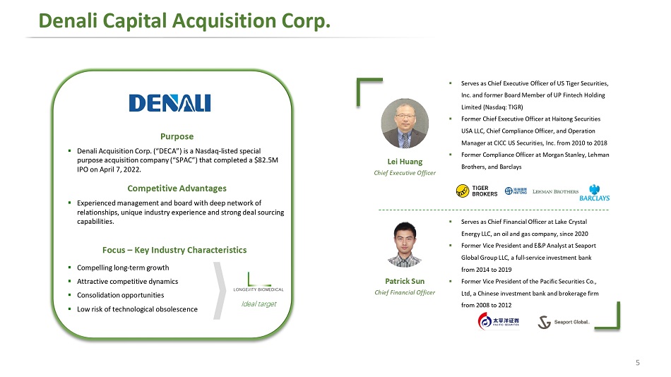 Disclaimer (contd.) 4 Use of Projections This Presentation contains projected financial information with respect to the Company, namely the information regarding the Deal Structure and Illustrative Sources & Uses on page 6 of this Presentation . Such projected financial information constitutes forward - looking information and is for illustrative purposes only and should not be relied upon as necessarily being indicative of future results . The projections, estimates and targets in this Presentation are forward - looking statements that are based on assumptions that are inherently subject to significant uncertainties and contingencies, many of which are beyond SPAC’s and the Company’s control . See “Cautionary Note Regarding Forward - Looking Statements” above . The assumptions and estimates underlying the projected, expected or target results are inherently uncertain and are subject to a wide variety of significant business, regulatory, research and development, competitive, technological and economic factors and other risks and uncertainties as described in the “Summary of Risk Factors” that could cause actual results to differ materially from those contained in such projections, estimates and targets . The inclusion of projections, estimates and targets in this Presentation should not be regarded as an indication that SPAC and the Company, or their representatives, considered or consider the financial projections, estimates and targets to be a reliable prediction of future events . Neither the independent auditors of SPAC nor the independent registered public accounting firm of the Company has audited, reviewed, compiled or performed any procedures with respect to the projections for the purpose of their inclusion in this Presentation, and accordingly, neither of them expressed an opinion or provided any other form of assurance with respect thereto for the purpose of this Presentation . Important Information for Investors and Stockholders The Business Combination will be submitted to shareholders of the SPAC for their consideration and approval at a special meeting of shareholders . The SPAC, Holdco and the Company have filed the Registration Statement with the SEC on July 13 , 2023 , which includes preliminary and definitive proxy statements to be distributed to the SPAC’s shareholders in connection with the SPAC’s solicitation for proxies for the vote by the SPAC’s shareholders in connection with the Business Combination and other matters as described in the Registration Statement, as well as the prospectus relating to the offer of the securities to be issued to the Company’s shareholders in connection with the completion of the Business Combination . After the Registration Statement has been declared effective, the SPAC will mail a definitive proxy statement and other relevant documents to its shareholders as of the record date established for voting on the Business Combination . The SPAC’s shareholders and other interested persons are advised to read the preliminary proxy statement/prospectus and any amendments thereto and, once available, the definitive proxy statement/prospectus, in connection with the SPAC’s solicitation of proxies for its special meeting of shareholders to be held to approve, among other things, the Business Combination, because these documents will contain important information about the SPAC, the Company and the Business Combination . Shareholders may also obtain a copy of the preliminary or definitive proxy statement, once available, as well as other documents filed with the SEC regarding the Business Combination and other documents filed with the SEC by the SPAC, without charge, at the SEC’s website located at www . sec . gov . or by directing a request to Denali Capital Acquisition Corp . , 437 Madison Avenue, 27 th Floor, New York, New York 10022 . The SPAC and the Company and their respective directors and executive officers, under SEC rules, may be deemed to be participants in the solicitation of proxies of the SPAC’s shareholders in connection with the Business Combination . Investors and security holders may obtain more detailed information regarding the SPAC’s directors and executive officers in the SPAC’s filings with the SEC . Information regarding the persons who may, under SEC rules, be deemed participants in the solicitation of proxies to the SPAC’s shareholders in connection with the Business Combination, including a description of their direct and indirect interests, which may, in some cases, be different than those of the SPAC’s shareholders generally, will be set forth in the Registration Statement . Shareholders, potential investors and other interested persons should read the Registration Statement carefully when it becomes available before making any voting or investment decisions . This Presentation is not a substitute for the Registration Statement or for any other document that the SPAC may file with the SEC in connection with the Business Combination . INVESTORS AND SECURITY HOLDERS ARE URGED TO READ THE DOCUMENTS FILED WITH THE SEC CAREFULLY AND IN THEIR ENTIRETY WHEN THEY BECOME AVAILABLE BECAUSE THEY WILL CONTAIN IMPORTANT INFORMATION . Investors and security holders may obtain free copies of other documents filed with the SEC by the SPAC through the website maintained by the SEC at http : //www . sec . gov . Changes and Additional Information in Connection with SEC Filings The information in this Presentation has not been reviewed by the SEC and certain information, such as financial measures referenced herein, may not comply in certain respects with SEC rules . As a result, the information in the Registration Statement may differ from this Presentation to comply with SEC rules . The Registration Statement includes substantial additional information about the Company and SPAC not contained in this Presentation . The information in the Registration Statement, as updated, supersedes the informati