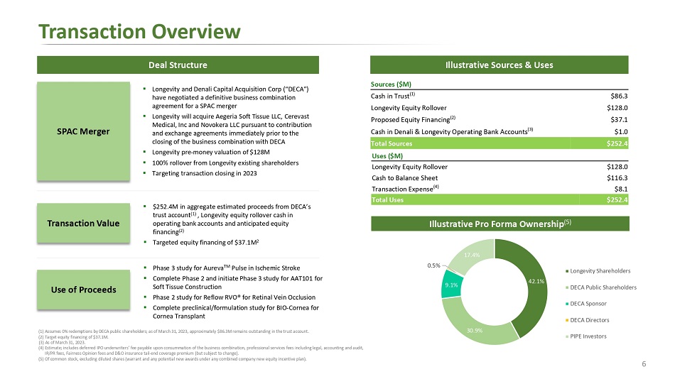Transaction Overview 6 Deal Structure Illustrative Pro Forma Ownership (5) Illustrative Sources & Uses SPAC Merger Transaction Value Use of Proceeds ▪ Longevity and Denali Capital Acquisition Corp (“DECA”) have negotiated a definitive business combination agreement for a SPAC merger ▪ Longevity will acquire Aegeria Soft Tissue LLC, Cerevast Medical, Inc and Novokera LLC pursuant to contribution and exchange agreements immediately prior to the closing of the business combination with DECA ▪ Longevity pre - money valuation of $128M ▪ 100% rollover from Longevity existing shareholders ▪ Targeting transaction closing in 2023 ▪ $252.4M in aggregate estimated proceeds from DECA’s trust account (1) , Longevity equity rollover cash in operating bank accounts and anticipated equity financing (2) ▪ Targeted equity financing of $37.1M 2 ▪ Phase 3 study for Aureva TM Pulse in Ischemic Stroke ▪ Complete Phase 2 and initiate Phase 3 study for AAT101 for Soft Tissue C onstruction ▪ Phase 2 study for Reflow RVO® for R etinal Vein Occlusion ▪ Complete preclinical/formulation study for BIO - Cornea for Cornea Transplant Uses ($M) Longevity Equity Rollover $ 128.0 Cash to Balance Sheet $ 116.3 Transaction Expense (4) $8.1 Total Uses $ 252.4 Sources ($M) Cash in Trust (1) $ 86.3 Longevity Equity Rollover $ 128.0 Proposed Equity Financing (2) $37.1 Cash in Denali & Longevity Operating Bank Accounts (3) $1.0 Total Sources $ 252.4 (1) Assumes 0% redemptions by DECA public shareholders; as of March 31, 2023, approximately $86.3M remains outstanding in the trust account. (2) Target equity financing of $37.1M. (3) As of March 31, 2023. (4) Estimate; includes deferred IPO underwriters’ fee payable upon consummation of the business combination, professional services fees including legal, accounting and audit, IR/PR fees, Fairness Opinion fees and D&O insurance tail - end coverage premium (but subject to change). (5) Of common stock, excluding diluted shares (warrant and any potential new awards under any combined company new equity incentive plan). 42.1% 30.9% 9.1% 0.5% 17.4% Longevity Shareholders DECA Public Shareholders DECA Sponsor DECA Directors PIPE Investors