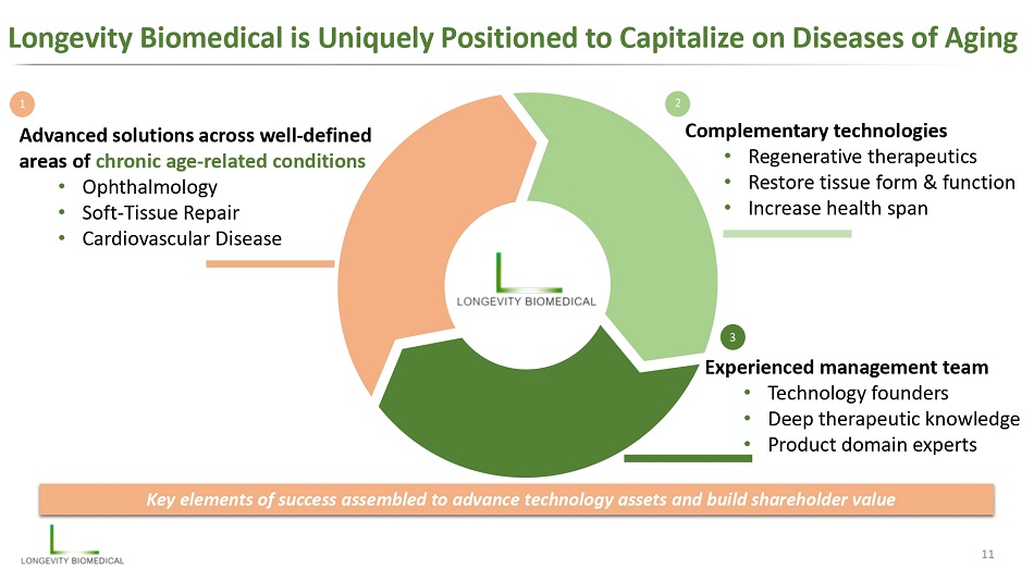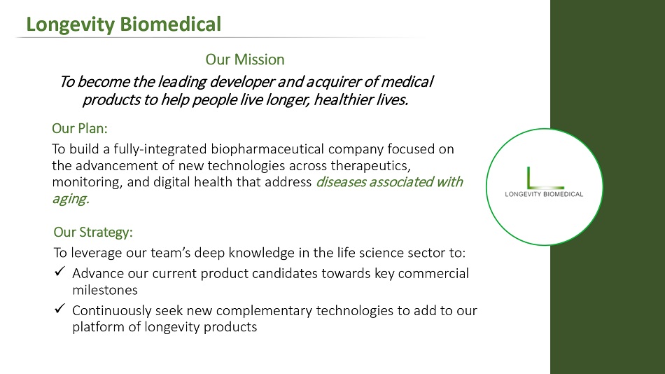 Longevity Biomedical Our Plan : To build a fully - integrated biopharmaceutical company focused on the advancement of new technologies across therapeutics, monitoring, and digital health that address diseases associated with aging. Our Mission To become the leading developer and acquirer of medical products to help people live longer, healthier lives. Our Strategy : To leverage our team’s deep knowledge in the life science sector to: x Advance our current product candidates towards key commercial milestones x Continuously seek new complementary technologies to add to our platform of longevity products