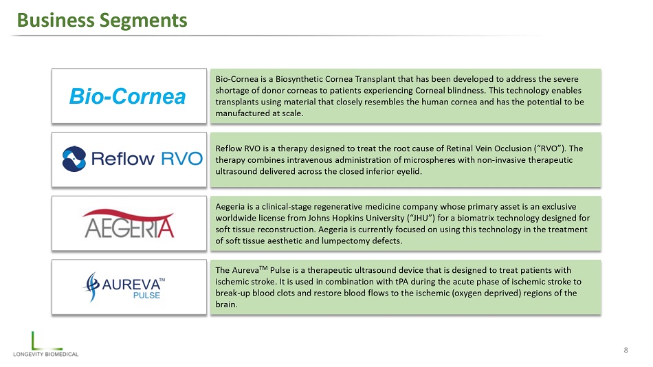 8 Business Segments Bio - Cornea is a Biosynthetic Cornea Transplant that has been developed to address the severe shortage of donor corneas to patients experiencing Corneal blindness. This technology enables transplants using material that closely resembles the human cornea and has the potential to be manufactured at scale. Bio - Cornea Reflow RVO is a therapy designed to treat the root cause of Retinal Vein Occlusion (“RVO”). The therapy combines intravenous administration of microspheres with non - invasive therapeutic ultrasound delivered across the closed inferior eyelid. The Aureva TM Pulse is a therapeutic ultrasound device that is designed to treat patients with ischemic stroke. It is used in combination with tPA during the acute phase of ischemic stroke to break - up blood clots and restore blood flows to the ischemic (oxygen deprived) regions of the brain. Aegeria is a clinical - stage regenerative medicine company whose primary asset is an exclusive worldwide license from Johns Hopkins University (“JHU”) for a biomatrix technology designed for soft tissue reconstruction. Aegeria is currently focused on using this technology in the treatment of soft tissue aesthetic and lumpectomy defects.