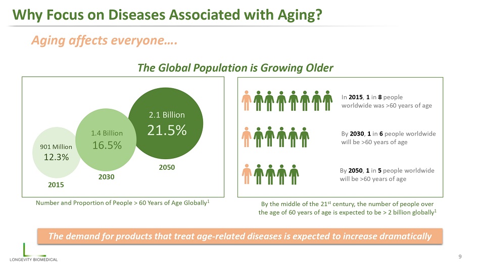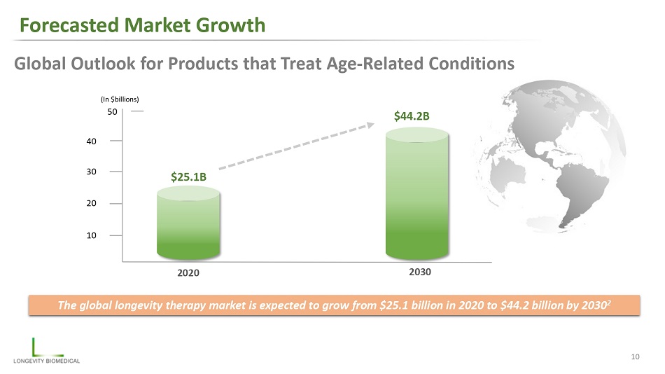 9 Why Focus on Diseases Associated with Aging? The Global Population is Growing Older The demand for products that treat age - related diseases is expected to increase dramatically 901 Million 12.3% 1.4 Billion 16.5% 2.1 Billion 21.5% 2015 2030 2050 Number and Proportion of People > 60 Years of Age Globally 1 Aging affects everyone…. In 2015 , 1 in 8 people worldwide was >60 years of age By 2030 , 1 in 6 people worldwide will be >60 years of age By 2050 , 1 in 5 people worldwide will be >60 years of age By the middle of the 21 st century, the number of people over the age of 60 years of age is expected to be > 2 billion globally 1