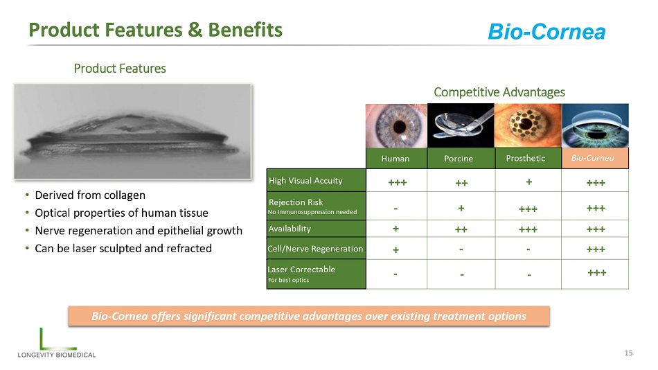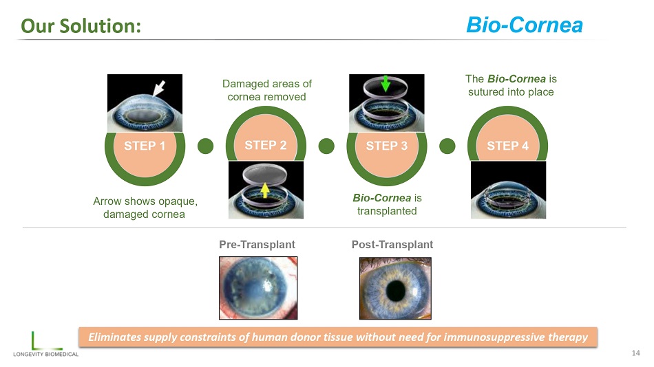 Our Solution: 14 STEP 1 STEP 2 STEP 3 STEP 4 Arrow shows opaque, damaged cornea Damaged areas of cornea removed Bio - Cornea is transplanted The Bio - Cornea is sutured into place Bio - Cornea Pre - Transplant Post - Transplant Eliminates supply constraints of human donor tissue without need for immunosuppressive therapy