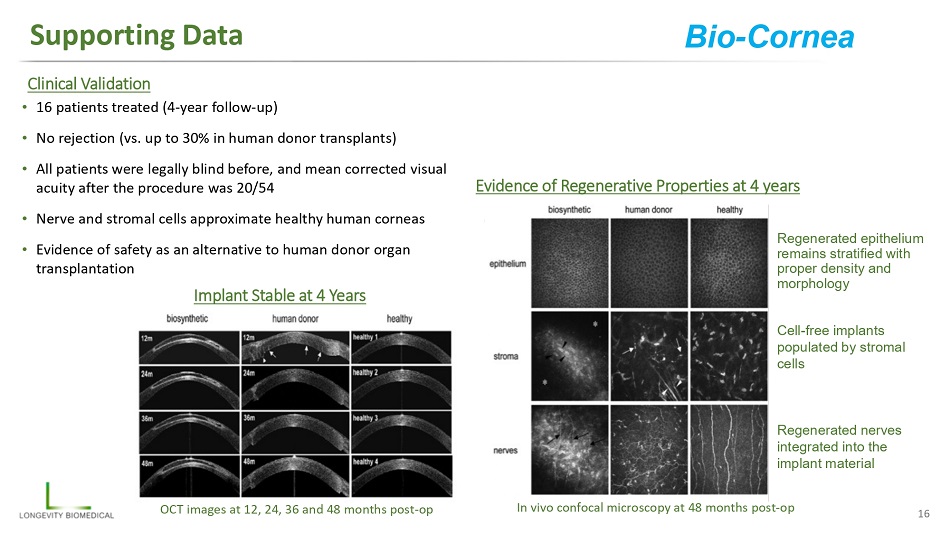 Product Features & Benefits • Derived from collagen • Optical properties of human tissue • Nerve regeneration and epithelial growth • Can be laser sculpted and refracted 15 High Visual Accuity Rejection Risk Availability Cell/Nerve Regeneration Laser Correctable Human Porcine Prosthetic Bio - Cornea +++ ++ + +++ No Immunosuppression needed - + +++ +++ + ++ +++ +++ + - - +++ For best optics - - - +++ Product Features Competitive Advantages Bio - Cornea offers significant competitive advantages over existing treatment options Bio - Cornea