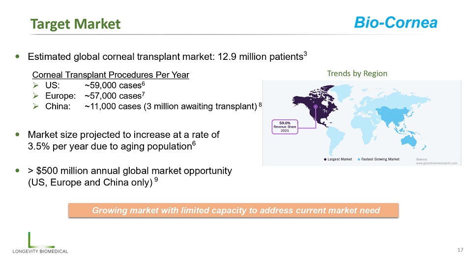 Supporting Data 16 • 16 patients treated (4 - year follow - up) • No rejection (vs. up to 30% in human donor transplants) • All patients were legally blind before, and mean corrected visual acuity after the procedure was 20/54 • Nerve and stromal cells approximate healthy human corneas • Evidence of safety as an alternative to human donor organ transplantation Clinical Validation Implant Stable at 4 Years Bio - Cornea OCT images at 12, 24, 36 and 48 months post - op In vivo confocal microscopy at 48 months post - op Regenerated epithelium remains stratified with proper density and morphology Cell - free implants populated by stromal cells Evidence of Regenerative Properties at 4 years Regenerated nerves integrated into the implant material