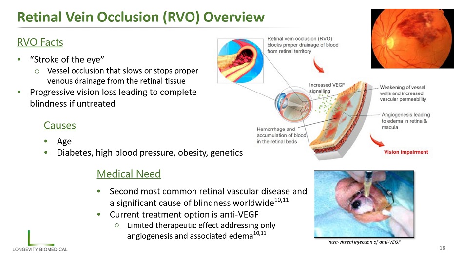 Retinal Vein Occlusion (RVO) Overview • Second most common retinal vascular disease and a significant cause of blindness worldwide 10,11 • Current treatment option is anti - VEGF o Limited therapeutic effect addressing only angiogenesis and associated edema 10,11 Medical Need RVO Facts 18 Causes • “Stroke of the eye” o Vessel occlusion that slows or stops proper venous drainage from the retinal tissue • Progressive vision loss leading to complete blindness if untreated • Age • Diabetes, high blood pressure, obesity, genetics Intra - vitreal injection of anti - VEGF