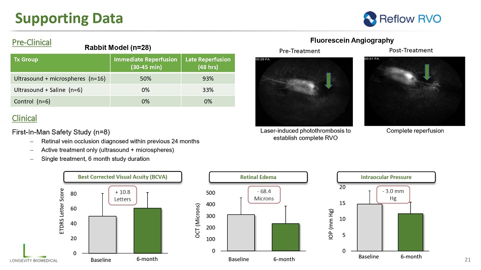 Product Features & Benefits 20 Ultrasound - Induced Microsphere Cavitation 3 Retinal Vein Occlusion 1 Intravenous Microsphere Introduction 2 Restoration of Blood Flow 4 Microsphere at Rest • Microspheres stable in circulation • Small size facilitates clot penetration 3  m At Rest 1 Microsphere Cavitation in the Presence of Ultrasound • Acoustic pressure fluctuations induce microspheres to expand & contract (cavitation) Expansion & Contraction Cycle 2 • Microspheres breakdown in circulation: gas exhaled via respiration and lipids metabolized by liver Fragmentation & Dispersion 3 Cavitational energy enables safe, non - invasive recanalization of vessel occlusions Mechanism of Action Octafluoropropane DPPA DPPC DPPE Lipid shell Gas core Lipid Microspheres Ocular Ultrasound Device • Dual imaging and therapeutic functionality • Touchscreen controls/display • Proprietary ultra - high bandwidth ocular probe • 1.1 - 3.3 μ m In Diameter: Small size enables microspheres to pass through occlusion • Acoustically Active: Ultrasound pressure fluctuations induce microsphere cavitation to disrupt retinal vein occlusion