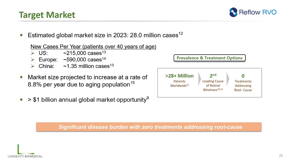 • Estimated global market size in 2023: 28.0 million cases 12 New Cases Per Year (patients over 40 years of age) » US: ~215,000 cases 13 » Europe: ~590,000 cases 14 » China: ~1.35 million cases 13 • Market size projected to increase at a rate of 8.8% per year due to aging population 15 • > $1 billion annual global market opportunity 9 Target Market 22 Significant disease burden with zero treatments addressing root - cause Prevalence & Treatment Options >28+ Million Patients Worldwide 12 0 Treatments Addressing Root - Cause 2 nd Leading Cause of Retinal Blindness 10,11