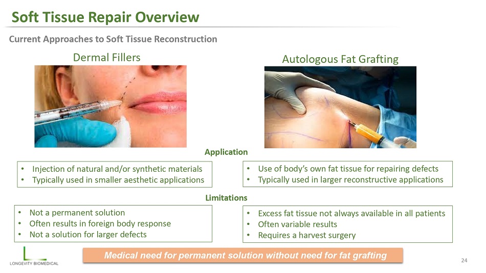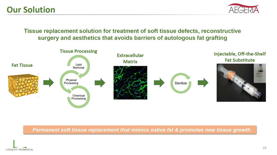 Soft Tissue Repair Overview 24 Current Approaches to Soft Tissue Reconstruction Dermal Fillers • Injection of natural and/or synthetic materials • Typically used in smaller aesthetic applications Limitations • Not a permanent solution • Often results in foreign body response • Not a solution for larger defects Application Autologous Fat Grafting • Use of body’s own fat tissue for repairing defects • Typically used in larger reconstructive applications • Excess fat tissue not always available in all patients • Often variable results • Requires a harvest surgery Medical need for permanent solution without need for fat grafting