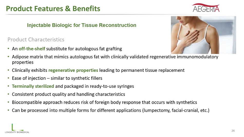 Tissue replacement solution for treatment of soft tissue defects, reconstructive surgery and aesthetics that avoids barriers of autologous fat grafting Our Solution 25 Lipid Removal Physical Processing Chemical Processing Sterilize Fat Tissue Extracellular Matrix Injectable, Off - the - Shelf Fat Substitute Permanent soft tissue replacement that mimics native fat & promotes new tissue growth Tissue Processing