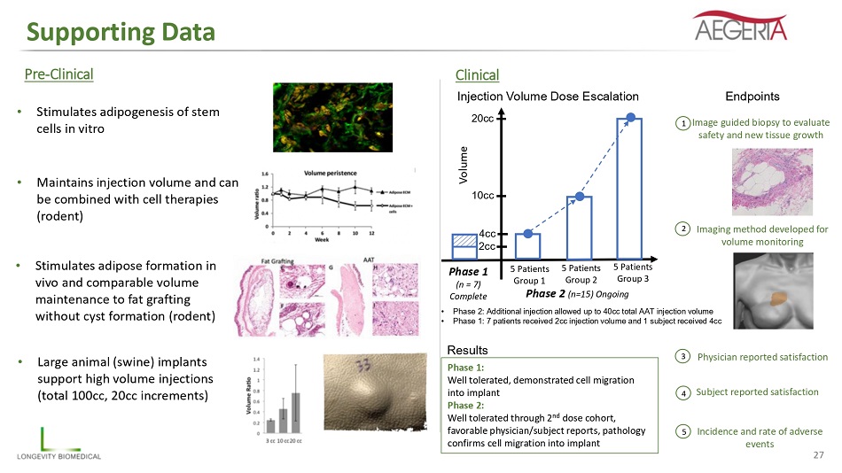 • An off - the - shelf substitute for autologous fat grafting • Adipose matrix that mimics autologous fat with clinically validated regenerative immunomodulatory properties • Clinically exhibits regenerative properties leading to permanent tissue replacement • Ease of injection – similar to synthetic fillers • Terminally sterilized and packaged in ready - to - use syringes • Consistent product quality and handling characteristics • Biocompatible approach reduces risk of foreign body response that occurs with synthetics • Can be processed into multiple forms for different applications (lumpectomy, facial - cranial, etc.) Injectable Biologic for Tissue Reconstruction Product Features & Benefits 26 Product Characteristics