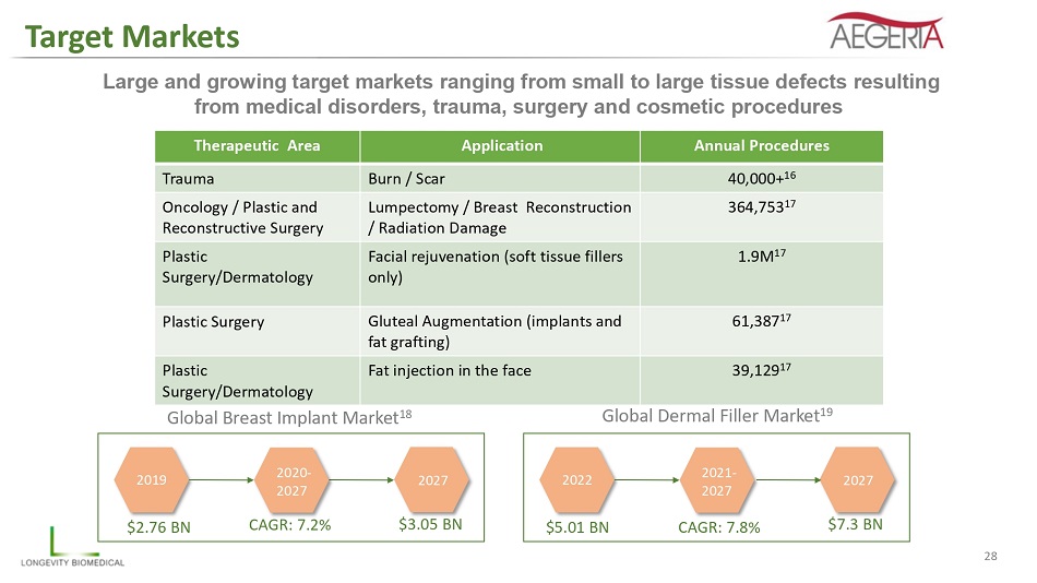 Supporting Data 27 Pre - Clinical • Stimulates adipogenesis of stem cells in vitro • Maintains injection volume and can be combined with cell therapies (rodent) • Stimulates adipose formation in vivo and comparable volume maintenance to fat grafting without cyst formation (rodent) • Large animal (swine) implants support high volume injections (total 100cc, 20cc increments) Clinical Volume 4cc 2cc Phase 1 (n = 7) Complete Phase 2 (n=15) Ongoing 5 Patients Group 1 5 Patients Group 2 5 Patients Group 3 10cc 20cc Injection Volume Dose Escalation Image guided biopsy to evaluate safety and new tissue growth Imaging method developed for volume monitoring Endpoints Physician reported satisfaction Subject reported satisfaction 1 2 3 4 Incidence and rate of adverse events 5 Phase 1: Well tolerated, demonstrated cell migration into implant Phase 2: Well tolerated through 2 nd dose cohort, favorable physician/subject reports, pathology confirms cell migration into implant Results • Phase 2: Additional injection allowed up to 40cc total AAT injection volume • Phase 1: 7 patients received 2cc injection volume and 1 subject received 4cc