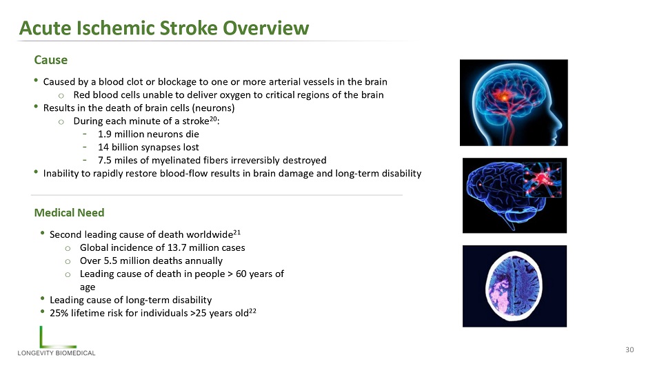Acute Ischemic Stroke Overview 30 • Second leading cause of death worldwide 21 o Global incidence of 13.7 million cases o Over 5.5 million deaths annually o Leading cause of death in people > 60 years of age • Leading cause of long - term disability • 25% lifetime risk for individuals >25 years old 22 • Caused by a blood clot or blockage to one or more arterial vessels in the brain o Red blood cells unable to deliver oxygen to critical regions of the brain • Results in the death of brain cells (neurons) o During each minute of a stroke 20 : - 1.9 million neurons die - 14 billion synapses lost - 7.5 miles of myelinated fibers irreversibly destroyed • Inability to rapidly restore blood - flow results in brain damage and long - term disability Medical Need Cause