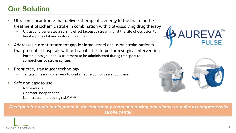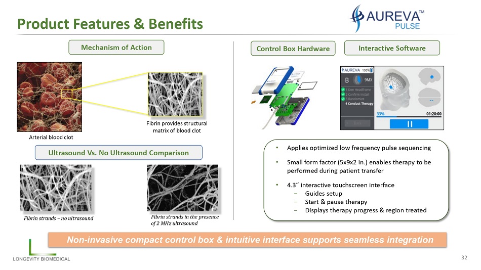 Designed for rapid deployment in the emergency room and during ambulance transfer to comprehensive stroke center • Ultrasonic headframe that delivers therapeutic energy to the brain for the treatment of ischemic stroke in combination with clot - dissolving drug therapy - Ultrasound generates a stirring effect (acoustic streaming) at the site of occlusion to break - up the clot and restore blood flow • Addresses current treatment gap for large vessel occlusion stroke patients that present at hospitals without capabilities to perform surgical intervention - Portable design enables treatment to be administered during transport to comprehensive stroke centers • Proprietary transducer technology - Targets ultrasound delivery to confirmed region of vessel occlusion • Safe and easy to use - Non - invasive - Operator independent - No increase in bleeding risk 24,25,26 Our Solution 31