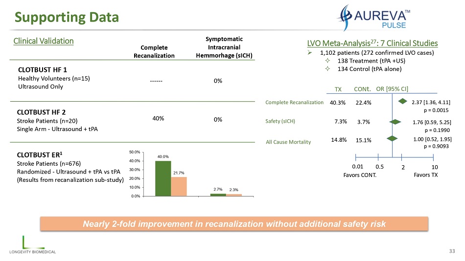 Non - invasive compact control box & intuitive interface supports seamless integration Product Features & Benefits 32 Control Box Hardware Interactive Software • Applies optimized low frequency pulse sequencing • Small form factor (5x9x2 in.) enables therapy to be performed during patient transfer • 4.3” interactive touchscreen interface − Guides setup − Start & pause therapy − Displays therapy progress & region treated Mechanism of Action Fibrin provides structural matrix of blood clot Arterial blood clot Ultrasound Vs. No Ultrasound Comparison Fibrin strands – no ultrasound Fibrin strands in the presence of 2 MHz ultrasound