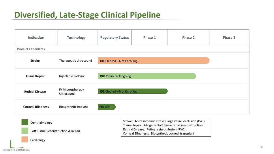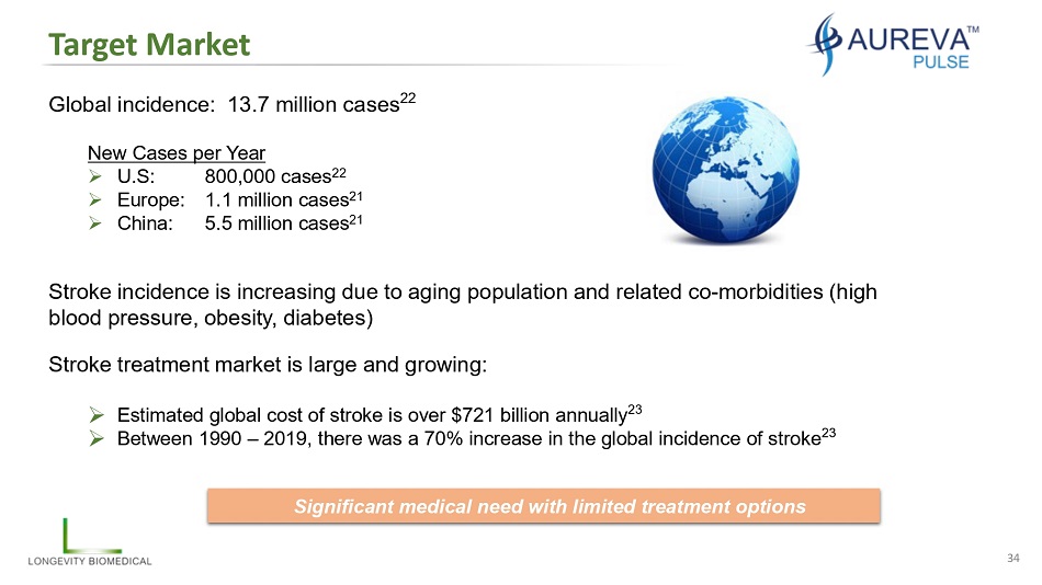 Significant medical need with limited treatment options Global incidence: 13.7 million cases 22 New Cases per Year » U.S: 800,000 cases 22 » Europe: 1.1 million cases 21 » China: 5.5 million cases 21 Stroke incidence is increasing due to aging population and related co - morbidities (high blood pressure, obesity, diabetes) Stroke treatment market is large and growing: » Estimated global cost of stroke is over $721 billion annually 23 » Between 1990 – 2019, there was a 70% increase in the global incidence of stroke 23 Target Market 34