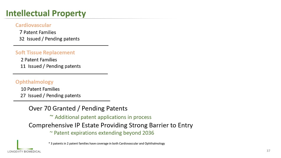 Over 70 Granted / Pending Patents ~ Additional patent applications in process Comprehensive IP Estate Providing Strong Barrier to Entry ~ Patent expirations extending beyond 2036 Intellectual Property Cardiovascular 7 Patent Families 32 Issued / Pending patents Soft Tissue Replacement 2 Patent Families 11 Issued / Pending patents Ophthalmology 10 Patent Families 27 Issued / Pending patents 37 * 3 patents in 2 patent families have coverage in both Cardiovascular and Ophthalmology