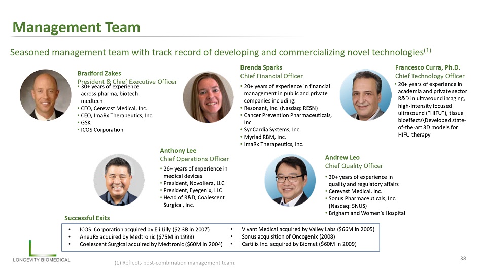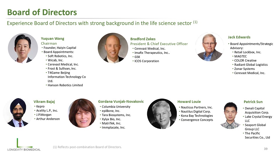 Board of Directors Yuquan Wang Chairman 39 Experience Board of Directors with strong background in the life science sector (1) Bradford Zakes President & Chief Executive Officer (1) Reflects post - combination Board of Directors. Jack Edwards Vikram Bajaj Gordana Vunjak - Novakovic Howard Louie • Cerevast Medical, Inc. • ImaRx Therapeutics, Inc.. • GSK • ICOS Corporation • Founder, Haiyin Capital • Board Appointments: • Soft Robotics, Inc. • Wicab , Inc. • Cerevast Medical, Inc. • Frost & Sullivan, Inc. • T4Game Beijing Information Technology Co Ltd. • Hanson Robotics Limited • Board Appointments/Strategic Advisory: • Retail Lockbox, Inc. • MAGTEC • COLOR Creative • Radiant Global Logistics • Zonar Systems • Cerevast Medical, Inc. • Kepro • Acelity L.P., Inc. • J.P.Morgan • Arthur Anderson • Columbia University • epiBone , Inc. • Tara Biosystems, Inc. • Xylyx Bio, Inc. • MatriTek , Inc. • Immplacate , Inc. • Nauticus Partners, Inc. • Nautilus Digital Corp. • Kona Bay Technologies • Convergence Concepts Patrick Sun • Denali Capital Acquisition Corp. • Lake Crystal Energy LLC • Seaport Global Group LLC • The Pacific Securities Co., Ltd