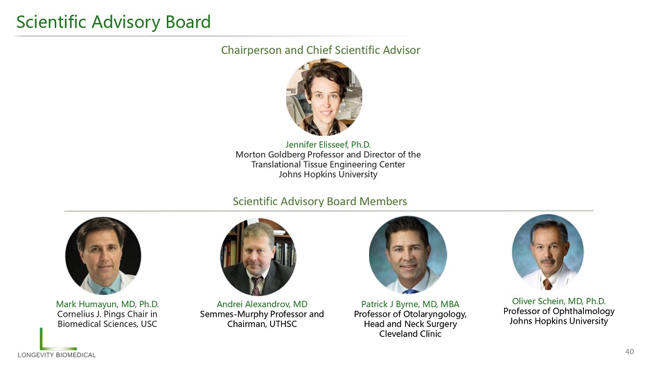 Jennifer Elisseef , Ph.D. Morton Goldberg Professor and Director of the Translational Tissue Engineering Center Johns Hopkins University Andrei Alexandrov , MD Semmes - Murphy Professor and Chairman, UTHSC Patrick J Byrne, MD , MBA Professor of Otolaryngology, Head and Neck Surgery Cleveland Clinic Scientific Advisory Board Oliver Schein, MD, Ph.D. Professor of Ophthalmology Johns Hopkins University Mark Humayun, MD, Ph.D. Cornelius J. Pings Chair in Biomedical Sciences, USC Chairperson and Chief Scientific Advisor Scientific Advisory Board Members 40