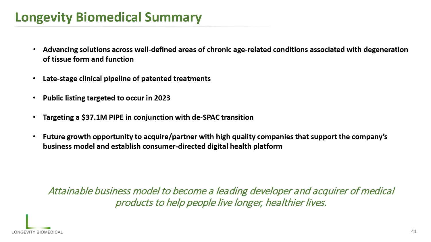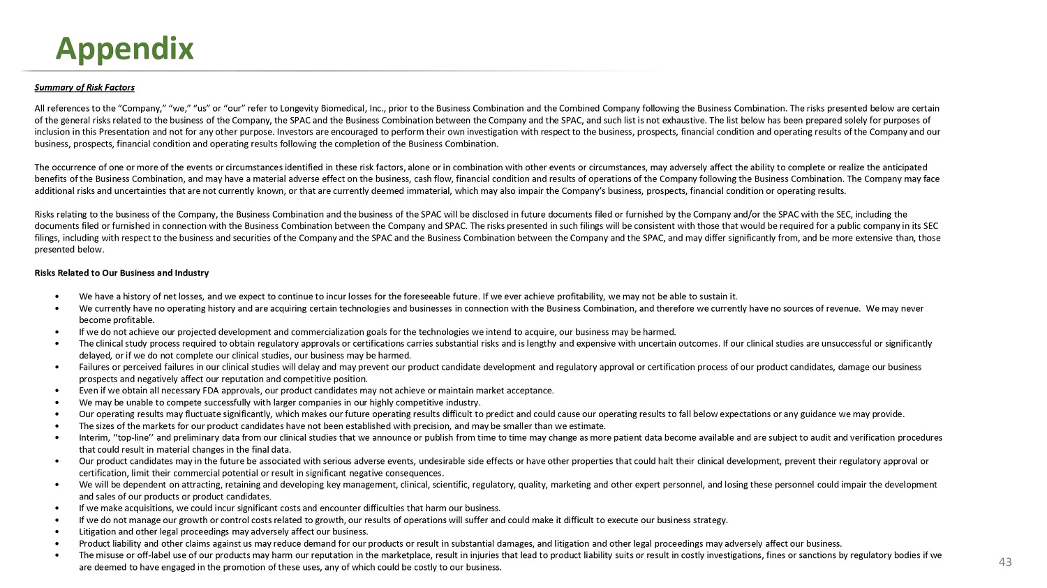 Appendix 43 Summary of Risk Factors All references to the “Company,” “we,” “us” or “our” refer to Longevity Biomedical, Inc., prior to the Business Combination a nd the Combined Company following the Business Combination. The risks presented below are certain of the general risks related to the business of the Company, the SPAC and the Business Combination between the Company and th e S PAC, and such list is not exhaustive. The list below has been prepared solely for purposes of inclusion in this Presentation and not for any other purpose. Investors are encouraged to perform their own investigation wit h r espect to the business, prospects, financial condition and operating results of the Company and our business, prospects, financial condition and operating results following the completion of the Business Combination. The occurrence of one or more of the events or circumstances identified in these risk factors, alone or in combination with o the r events or circumstances, may adversely affect the ability to complete or realize the anticipated benefits of the Business Combination, and may have a material adverse effect on the business, cash flow, financial condition and results of operations of the Company following the Business Combination. The Company may face additional risks and uncertainties that are not currently known, or that are currently deemed immaterial, which may also impa ir the Company’s business, prospects, financial condition or operating results. Risks relating to the business of the Company, the Business Combination and the business of the SPAC will be disclosed in fut ure documents filed or furnished by the Company and/or the SPAC with the SEC, including the documents filed or furnished in connection with the Business Combination between the Company and SPAC. The risks presented in su ch filings will be consistent with those that would be required for a public company in its SEC filings, including with respect to the business and securities of the Company and the SPAC and the Business Combination betwe en the Company and the SPAC, and may differ significantly from, and be more extensive than, those presented below. Risks Related to Our Business and Industry • We have a history of net losses, and we expect to continue to incur losses for the foreseeable future. If we ever achieve pro f itability, we may not be able to sustain it. • We currently have no operating history and are acquiring certain technologies and businesses in connection with the Business C ombination, and therefore we currently have no sources of revenue. We may never become profitable. • If we do not achieve our projected development and commercialization goals for the technologies we intend to acquire, our bus i ness may be harmed. • The clinical study process required to obtain regulatory approvals or certifications carries substantial risks and is lengthy and expensive with uncertain outcomes. If our clinical studies are unsuccessful or significantly delayed, or if we do not complete our clinical studies, our business may be harmed. • Failures or perceived failures in our clinical studies will delay and may prevent our product candidate development and regul a tory approval or certification process of our product candidates, damage our business prospects and negatively affect our reputation and competitive position. • Even if we obtain all necessary FDA approvals, our product candidates may not achieve or maintain market acceptance. • We may be unable to compete successfully with larger companies in our highly competitive industry. • Our operating results may fluctuate significantly, which makes our future operating results difficult to predict and could ca u se our operating results to fall below expectations or any guidance we may provide. • The sizes of the markets for our product candidates have not been established with precision, and may be smaller than we esti m ate. • Interim, ‘‘top - line’’ and preliminary data from our clinical studies that we announce or publish from time to time may change as more patient data become available and are subject to audit and verification procedures that could result in material changes in the final data. • Our product candidates may in the future be associated with serious adverse events, undesirable side effects or have other pr o perties that could halt their clinical development, prevent their regulatory approval or certification, limit their commercial potential or result in significant negative consequences. • We will be dependent on attracting, retaining and developing key management, clinical, scientific, regulatory, quality, marke t ing and other expert personnel, and losing these personnel could impair the development and sales of our products or product candidates. • If we make acquisitions, we could incur significant costs and encounter difficulties that harm our business. • If we do not manage our growth or control costs related to growth, our results of operations will suffer and could make it di f ficult to execute our business strategy. • Litigation and other legal proceedings may adversely affect our business. • Product liability and other claims against us may reduce demand for our products or result in substantial damages, and litiga t ion and other legal proceedings may adversely affect our business. • The misuse or off - label use of our products may harm our reputation in the marketplace, result in injuries that lead to produc t liability suits or result in costly investigations, fines or sanctions by regulatory bodies if we are deemed to have engaged in the promotion of these uses, any of which could be costly to our business.