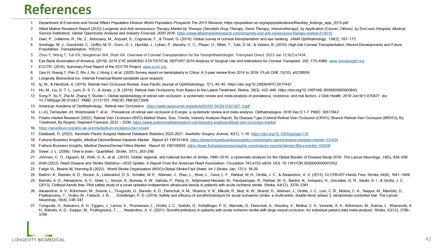 References 42 1. Department of Economic and Social Affairs Population Division World Population Prospects The 2015 Revision, https://population.un.org/wpp/publications/files/key_findings_wpp_2015.pdf 2. Allied Marker Research Report (2022) Longevity and Anti - senescence Therapy Market by Therapy ( Senolytic Drug Therapy, Gene Therapy, Immunotherapy), by Application (Cancer, Others), by End user (Hospital, Medical Service Institution): Global Opportunity Analysis and Industry Forecast, 2020 - 2030. https://www.alliedmarketresearch.com/longevity - and - anti - senescence - therapy - market - A14010 3. Gain, P., Jullienne , R., He, Z., Aldossary , M., Acquart , S., Cognasse , F., & Thuret , G. (2016). Global survey of corneal transplantation and eye banking. JAMA Ophthalmology , 134 (2), 167 – 173. 4. Armitage, W. J., Goodchild, C., Griffin, M. D., Gunn, D. J., Hjortdal , J., Lohan, P., Murphy, C. C., Pleyer , U., Ritter, T., Tole, D. M., & Vabres , B. (2019). High - risk Corneal Transplantation: Recent Developments and Future Possibilities. Transplantation, 103(12) 5. Zhou Y, Wang T, Tuli SS, Steigleman WA, Shah AA. Overview of Corneal Transplantation for the Nonophthalmologist . Transplant Direct. 2023 Jan 12;9(2):e1434. . 6. Eye Bank Association of America. (2019). 2019 EYE BANKING STATISTICAL REPORT 2019 Analysis of Surgical Use and Indications for Corneal Transplant . 202 , 775 – 4999. www.restoresight.org 7. ECCTR. (2019). Summary Final Report of the ECCTR Project. www.ecctr.org 8. Gao H, Huang T, Pan Z, Wu J, Xu J, Hong J, et al. (2020) Survey report on keratoplasty in China: A 5 - year review from 2014 to 20 18. PLoS ONE 15(10): e0239939 9. Longevity Biomedical Inc. Internal Financial Model (available upon request) 10. Ip, M., & Hendrick, A. (2019). Retinal Vein Occlusion Review. Asia - Pacific Journal of Ophthalmology , 7 (1), 40 – 45. https:// doi.org /10.22608/APO.2017442 11. Ho, M., Liu, D. T. L., Lam, D. S. C., & Jonas, J. B. (2016). Retinal Vein Occlusions, from Basics to the Latest Treatment. Retina , 36 (3), 432 – 448. https://doi.org/10.1097/IAE.0000000000000843 . 12. Song P, Xu Y, Zha M, Zhang Y, Rudan I. Global epidemiology of retinal vein occlusion: a systematic review and meta - analysis of prevalence, incidence, and risk fact ors. J Glob Health. 2019 Jun;9(1):010427. doi : 10.7189/jogh.09.010427. PMID: 31131101; PMCID: PMC6513508. 13. American Academy of Ophthalmology, Retinal vein Occlusions: https://www.aaojournal.org/article/S0161 - 6420(15)01267 - 1/pdf 14. Li JQ, Terheyden JH, Welchowski T, et al. Prevalence of retinal vein occlusion in Europe: a systematic review and meta analysis. Opthalmologica . 2018 Dec;5:1 - 7. PMID: 30517942. 15. Polaris market Research (2022). Retinal Vein Occlusion (RVO) Market Share, Size, Trends, Industry Analysis Report, By Disease Ty pe (Central Retinal Vein Occlusion (CRVO), Branch Retinal Vein Occlusion (BRVO)); By Treatment; By Region; Segment Forecast, 2022 – 2030, https://www.polarismarketresearch.com/industry - analysis/retinal - vein - occlusion - market 16. https://ameriburn.org/who - we - are/media/burn - incidence - fact - sheet/ 17. Databank, N. (2022). Aesthetic Plastic Surgery National Databank Statistics 2020 - 2021. Aesthetic Surgery Journal , 42 (1), 1 – 18. https://doi.org/10.1093/asj/sjac116 18. Fortune Business Insights, Medical Device/Breast Implants Market. Report ID: FBI101404, https://www.fortunebusinessinsights.com/industry - reports/breast - implants - market - 101404 19. Fortune Business Insights, Medical Device/Dermal Fillers Market. Report ID: FBI100939, https://www.fortunebusinessinsights.com/industry - reports/dermal - fillers - market - 100939 20. Saver, J. L. (2006). Time is brain - Quantified. Stroke , 37 (1), 263 – 266 21. Johnson, C. O., Nguyen, M., Roth, G. A., et al.. (2019). Global, regional, and national burden of stroke, 1990 – 2016: a systemati c analysis for the Global Burden of Disease Study 2016. The Lancet Neurology , 18 (5), 439 – 458 22. AHA (2022). Heart Disease and Stroke Statistics — 2022 Update: A Report From the American Heart Association. Circulation 145:e153 – e639. DOI: 10.1161/CIR.0000000000001052 23. Feigin VL, Brainin M, Norrving B (2022). World Stroke Organization (WSO) Global Stroke Fact Sheet. Int J Stroke. Jan; 17(1): 18 - 29. 24. Barlinn , K., Barreto, A. D., Sisson, A., Liebeskind , D. S., Schafer, M. E., Alleman, J., Zhao, L., Shen, L., Cava, L. F., Rahbar, M. H., Grotta , J. C., & Alexandrov, A. V. (2013). CLOTBUST - Hands Free. Stroke, 44(6), 1641 – 1646 25. Barreto, A. D., Alexandrov, A. V., Shen, L., Sisson, A., Bursaw , A. W., Sahota, P., Peng, H., Ardjomand - Hessabi , M., Pandurengan , R., Rahbar, M. H., Barlinn , K., Indupuru , H., Gonzales, N. R., Savitz , S. I., & Grotta , J. C. (2013). Clotbust - hands free: Pilot safety study of a novel operator - independent ultrasound device in patients with acute ischemic stroke. Stroke , 44(12), 3376 – 3381 26. Alexandrov, A. V., Köhrmann , M., Soinne , L., Tsivgoulis , G., Barreto, A. D., Demchuk , A. M., Sharma, V. K., Mikulik , R., Muir, K. W., Brandt, G., Alleman, J., Grotta , J. C., Levi, C. R., Molina, C. A., Saqqur , M., Mavridis , D., Psaltopoulou , T., Vosko , M., Fiebach , J. B., … Schellinger , P. D. (2019). Safety and efficacy of sonothrombolysis for acute ischaemic stroke: a multicentre , double - blind, phase 3, randomised controlled trial. The Lancet Neurology, 18(4), 338 – 347 27. Tsivgoulis , G., Katsanos, A. H., Eggers, J., Larrue , V., Thomassen , L., Grotta , J. C., Seitidis , G., Schellinger , P. D., Mavridis , D., Demchuk , A., Novotny, V., Molina, C. A., Veroniki , A. A., Köhrmann , M., Soinne , L., Khanevski , A. N., Barreto, A. D., Saqqur , M., Psaltopoulou , T., … Alexandrov, A. V. (2021). Sonothrombolysis in patients with acute ischemic stroke with large vessel occlusion: An individual patient data meta - analysis. Stroke, 52(12), 3 786 – 3795