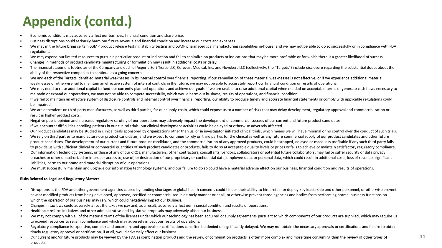 Appendix (contd.) 44 • Economic conditions may adversely affect our business, financial condition and share price. • Business disruptions could seriously harm our future revenue and financial condition and increase our costs and expenses. • We may in the future bring certain cGMP product release testing, stability testing and cGMP pharmaceutical manufacturing capa b ilities in - house, and we may not be able to do so successfully or in compliance with FDA regulations. • We may expend our limited resources to pursue a particular product or indication and fail to capitalize on products or indica t ions that may be more profitable or for which there is a greater likelihood of success. • Changes in methods of product candidate manufacturing or formulation may result in additional costs or delay. • The financial statement footnotes of the Company and each of Aegeria Soft Tissue LLC, Cerevast Medical, Inc. and Novokera LLC (collectively, the “Targets”) include disclosure regarding the substantial doubt about the ability of the respective companies to continue as a going concern. • We and each of the Targets identified material weaknesses in its internal control over financial reporting. If our remediatio n of these material weaknesses is not effective, or if we experience additional material weaknesses or otherwise fail to maintain an effective system of internal controls in the future, we may not be able to accura tel y report our financial condition or results of operations. • We may need to raise additional capital to fund our currently planned operations and achieve our goals. If we are unable to r a ise additional capital when needed on acceptable terms or generate cash flows necessary to maintain or expand our operations, we may not be able to compete successfully, which would harm our business, results of oper ati ons, and financial condition. • If we fail to maintain an effective system of disclosure controls and internal control over financial reporting, our ability t o produce timely and accurate financial statements or comply with applicable regulations could be impaired. • We are dependent on third party manufacturers, as well as third parties, for our supply chain, which could expose us to a num b er of risks that may delay development, regulatory approval and commercialization or result in higher product costs. • Negative public opinion and increased regulatory scrutiny of our operations may adversely impact the development or commercia l success of our current and future product candidates. • If we encounter difficulties enrolling patients in our clinical trials, our clinical development activities could be delayed o r otherwise adversely affected. • Our product candidates may be studied in clinical trials sponsored by organizations other than us, or in investigator initiat e d clinical trials, which means we will have minimal or no control over the conduct of such trials. • We rely on third parties to manufacture our product candidates, and we expect to continue to rely on third parties for the cl i nical as well as any future commercial supply of our product candidates and other future product candidates. The development of our current and future product candidates, and the commercialization of any approved p rod ucts, could be stopped, delayed or made less profitable if any such third party fails to provide us with sufficient clinical or commercial quantities of such product candidates or products, fails to do so at acc ept able quality levels or prices or fails to achieve or maintain satisfactory regulatory compliance. • Our information technology systems, or those of any of our CROs, manufacturers, other contractors, consultants, vendors, coll a borators or potential future collaborators, may fail or suffer security or data privacy breaches or other unauthorized or improper access to, use of, or destruction of our proprietary or confidential data, employe e d ata, or personal data, which could result in additional costs, loss of revenue, significant liabilities, harm to our brand and material disruption of our operations. • We must successfully maintain and upgrade our information technology systems, and our failure to do so could have a material a dverse effect on our business, financial condition and results of operations. Risks Related to Legal and Regulatory Matters • Disruptions at the FDA and other government agencies caused by funding shortages or global health concerns could hinder their ability to hire, retain or deploy key leadership and other personnel, or otherwise prevent new or modified products from being developed, approved, certified or commercialized in a timely manner or at all, or otherwi se prevent those agencies and bodies from performing normal business functions on which the operation of our business may rely, which could negatively impact our business. • Changes in tax laws could adversely affect the taxes we pay and, as a result, adversely affect our financial condition and re s ults of operations. • Healthcare reform initiatives and other administrative and legislative proposals may adversely affect our business. • We may not comply with all of the material terms of the licenses under which our technology has been acquired or supply agree m ents pursuant to which components of our products are supplied, which may require us to expend resources to regain compliance and which may adversely impact our results of operations. • Regulatory compliance is expensive, complex and uncertain, and approvals or certifications can often be denied or significant l y delayed. We may not obtain the necessary approvals or certifications and failure to obtain timely regulatory approval or certification, if at all, would adversely affect our business. • Our current and/or future products may be viewed by the FDA as combination products and the review of combination products is often more complex and more time consuming t