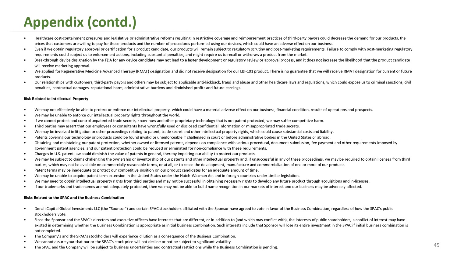 Appendix (contd.) 45 • Healthcare cost - containment pressures and legislative or administrative reforms resulting in restrictive coverage and reimburs ement practices of third - party payors could decrease the demand for our products, the prices that customers are willing to pay for those products and the number of procedures performed using our devices, which c oul d have an adverse effect on our business. • Even if we obtain regulatory approval or certification for a product candidate, our products will remain subject to regulator y scrutiny and post - marketing requirements. Failure to comply with post - marketing regulatory requirements could subject us to enforcement actions, including substantial penalties, and might require us to recall or with dra w a product from the market. • Breakthrough device designation by the FDA for any device candidate may not lead to a faster development or regulatory review or approval process, and it does not increase the likelihood that the product candidate will receive marketing approval. • We applied for Regenerative Medicine Advanced Therapy (RMAT) designation and did not receive designation for our LBI - 101 produ ct. There is no guarantee that we will receive RMAT designation for current or future products. • Our relationships with customers, third - party payors and others may be subject to applicable anti - kickback, fraud and abuse an d other healthcare laws and regulations, which could expose us to criminal sanctions, civil penalties, contractual damages, reputational harm, administrative burdens and diminished profits and future earnings. Risk Related to Intellectual Property • We may not effectively be able to protect or enforce our intellectual property, which could have a material adverse effect on our business, financial condition, results of operations and prospects. • We may be unable to enforce our intellectual property rights throughout the world. • If we cannot protect and control unpatented trade secrets, know - how and other proprietary technology that is not patent protec ted, we may suffer competitive harm. • Third parties may assert that our employees or consultants have wrongfully used or disclosed confidential information or misa p propriated trade secrets. • We may be involved in litigation or other proceedings relating to patent, trade secret and other intellectual property rights , which could cause substantial costs and liability. • Patents covering our technology or products could be found invalid or unenforceable if challenged in court or before administ r ative bodies in the United States or abroad. • Obtaining and maintaining our patent protection, whether owned or licensed patents, depends on compliance with various proced u ral, document submission, fee payment and other requirements imposed by government patent agencies, and our patent protection could be reduced or eliminated for non - compliance with these requirements. • Changes in U.S. patent law could diminish the value of patents in general, thereby impairing our ability to protect our produ c ts. • We may be subject to claims challenging the ownership or inventorship of our patents and other intellectual property and, if uns uccessful in any of these proceedings, we may be required to obtain licenses from third parties, which may not be available on commercially reasonable terms, or at all, or to cease the development, manufacture and co mmercialization of one or more of our products. • Patent terms may be inadequate to protect our competitive position on our product candidates for an adequate amount of time. • We may be unable to acquire patent term extension in the United States under the Hatch - Waxman Act and in foreign countries und er similar legislation. • We may need to obtain intellectual property rights from third parties and may not be successful in obtaining necess ary rights to develop any future product through acquisitions and in - licenses. • If our trademarks and trade names are not adequately protected, then we may not be able to build name recognition in our mark e ts of interest and our business may be adversely affected. Risks Related to the SPAC and the Business Combination • Denali Capital Global Investments LLC (the “Sponsor”) and certain SPAC stockholders affiliated with the Sponsor have agreed t o vote in favor of the Business Combination, regardless of how the SPAC’s public stockholders vote. • Since the Sponsor and the SPAC's directors and executive officers have interests that are different, or in addition to (and w h ich may conflict with), the interests of public shareholders, a conflict of interest may have existed in determining whether the Business Combination is appropriate as initial business combination. Such interests includ e t hat Sponsor will lose its entire investment in the SPAC if initial business combination is not completed. • The Company’s and the SPAC’s stockholders will experience dilution as a consequence of the Business Combination. • We cannot assure your that our or the SPAC’s stock price will not decline or not be subject to significant volatility. • The SPAC and the Company will be subject to business uncertainties and contractual restrictions while the Business Combinatio n is pending.