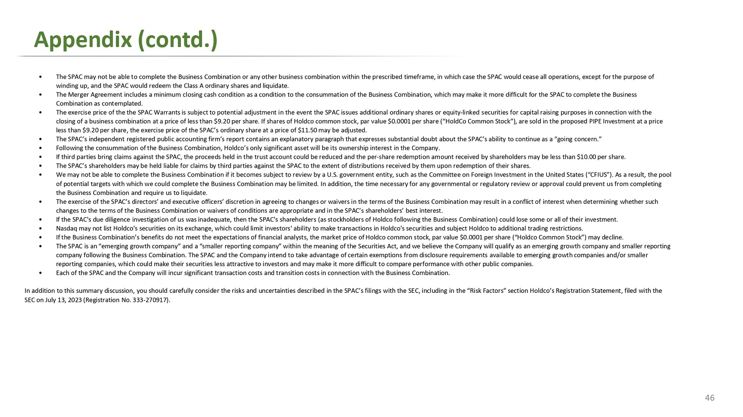 46 Appendix (contd.) • The SPAC may not be able to complete the Business Combination or any other business combination within the prescribed timefra m e, in which case the SPAC would cease all operations, except for the purpose of winding up, and the SPAC would redeem the Class A ordinary shares and liquidate. • The Merger Agreement includes a minimum closing cash condition as a condition to the consummation of the Business Combination , which may make it more difficult for the SPAC to complete the Business Combination as contemplated. • The exercise price of the the SPAC Warrants is subject to potential adjustment in the event the SPAC issues additional ordinary shares or equity - linked secur ities for capital raising purposes in connection with the closing of a business combination at a price of less than $9.20 per share. If shares of Holdco common stock, par value $0.000 1 p er share (“ HoldCo Common Stock”), are sold in the proposed PIPE Investment at a price less than $9.20 per share, the exercise price of the SPAC’s ordinary share at a price of $11.50 may be adjusted. • The SPAC’s independent registered public accounting firm’s report contains an explanatory paragraph that expresses substantia l doubt about the SPAC’s ability to continue as a “going concern.” • Following the consummation of the Business Combination, Holdco’s only significant asset will be its ownership interest in the Company. • If third parties bring claims against the SPAC, the proceeds held in the trust account could be reduced and the per - share rede mption amount received by shareholders may be less than $10.00 per share. • The SPAC’s shareholders may be held liable for claims by third parties against the SPAC to the extent of distributions receiv e d by them upon redemption of their shares. • We may not be able to complete the Business Combination if it becomes subject to review by a U.S. government entity, such as t he Committee on Foreign Investment in the United States (“CFIUS”). As a result, the pool of potential targets with which we could complete the Business Combination may be limited. In addition, the time necessary fo r a ny governmental or regulatory review or approval could prevent us from completing the Business Combination and require us to liquidate. • The exercise of the SPAC’s directors’ and executive officers’ discretion in agreeing to changes or waivers in the terms of th e Business Combination may result in a conflict of interest when determining whether such changes to the terms of the Business Combination or waivers of conditions are appropriate and in the SPAC’s shareholders’ bes t i nterest. • If the SPAC's due diligence investigation of us was inadequate, then the SPAC's shareholders (as stockholders of Holdco follo w ing the Business Combination) could lose some or all of their investment. • Nasdaq may not list Holdco's securities on its exchange, which could limit investors' ability to make transactions in Holdco' s securities and subject Holdco to additional trading restrictions. • If the Business Combination’s benefits do not meet the expectations of financial analysts, the market price of Holdco common s tock, par value $0.0001 per share (“Holdco Common Stock”) may decline. • The SPAC is an “emerging growth company” and a “smaller reporting company” within the meaning of the Securities Act, and we b e lieve the Company will qualify as an emerging growth company and smaller reporting company following the Business Combination. The SPAC and the Company intend to take advantage of certain exemptions from disc los ure requirements available to emerging growth companies and/or smaller reporting companies, which could make their securities less attractive to investors and may make it more difficult to compare pe rformance with other public companies. • Each of the SPAC and the Company will incur significant transaction costs and transition costs in connection with the Busines s Combination. In addition to this summary discussion, you should carefully consider the risks and uncertainties described in the SPAC’s fil ing s with the SEC, including in the “Risk Factors” section Holdco’s Registration Statement, filed with the SEC on July 13, 2023 (Registration No. 333 - 270917).