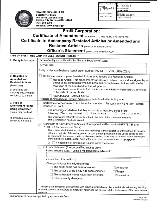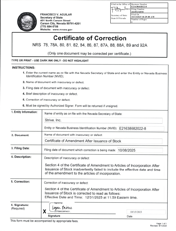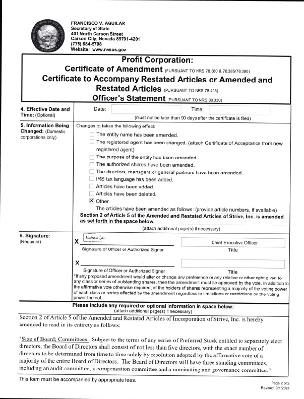 FRANCISCO V. AGUILAR Secretary of State 401 North Carson Street Carson City, Nevada 89701 - 4201 (775) 684 - 5708 Website: www.nvsos.gov Profit Corporation: Certificate of Amendment (PURSUANT TO NRS 78.380 & 78.385/78.390) Certificate to Accompany Restated Articles or Amended and Restated Articles (PURSUANT TO NRS 78.403) Officer's Statement (PURSUANT TO NRS 80.030) 4. Effective Date and Time: (Optional) Time: Date: (must not be later than 90 days after the certificate is filed) Changes to takes the following effect: E The entity name has been amended. E The registered agent has been changed. (attach Certificate of Acceptance from new registered agent) □ The purpose of the entity has been amended. □ The authorized shares have been amended. E The directors, managers or general partners have been amended. E IRS tax language has been added. E Articles have been added. E Articles have been deleted. X Other. The articles have been amended as follows: (provide article numbers, if available) 5. Information Being Changed: (Domestic corporations only) Section 2 of Article 5 of the Amended and Restated Articles of Strive, Inc. is amended as set forth in the space below. (attach additional page(s) if necessary) . ---- .. 6. Signature: (Required) Chief Executive Officer ittAKIA , (XL Signature of Officer or Authorized Signer Title X Signature of Officer or Authorized Signer Title *If any proposed amendment would alter or change any preference or any relative or other right given to any class or series of outstanding shares, then the amendment must be approved by the vote, in addition to the affirmative vote otherwise required, of the holders of shares representing a majority of the voting power of each class or series affected by the amendment regardless to limitations or restrictions on the voting power thereof. Please include any required or optional information in space below: (attach additional page(s) if necessary) Section 2 of Article 5 of the Amended and Restated Articles of Incorporation of Strive, Inc. is hereby amended to read in its entirety as follows: "Size of Board; Committees. Subject to the terms of any series of Preferred Stock entitled to separately elect directors, the Board of Directors shall consist of not less than five directors, with the exact number of directors to be determined from time to time solely by resolution adopted by the affirmative vote of a majority of the entire Board of Directors. The Board of Directors will have three standing committees, including an audit committee, a compensation committee and a nominating and governance committee." This form must be accompanied by appropriate fees. Page 2 of 2 Revised: 9/1/2023