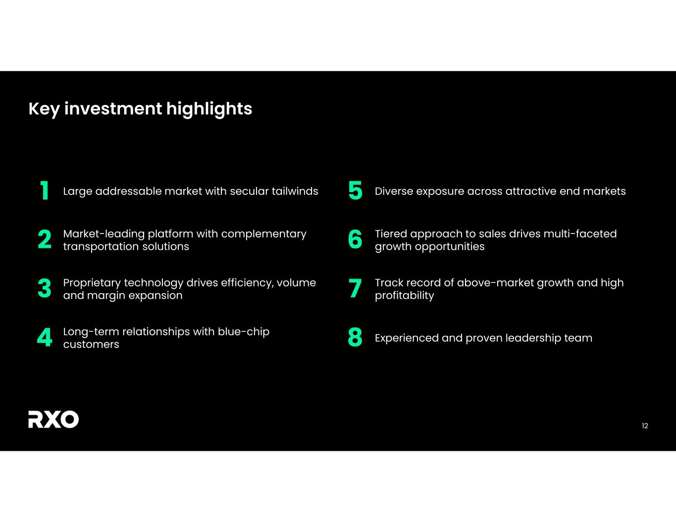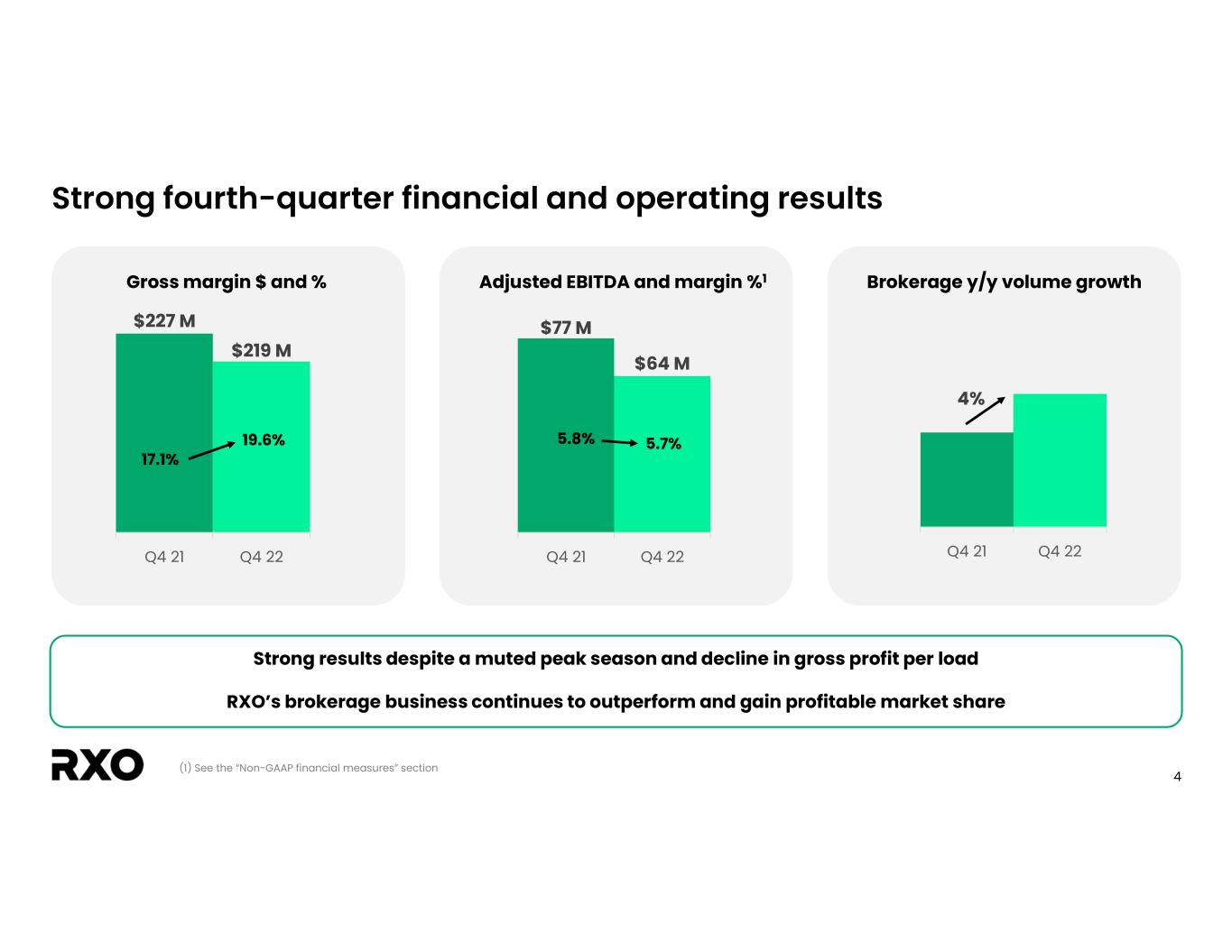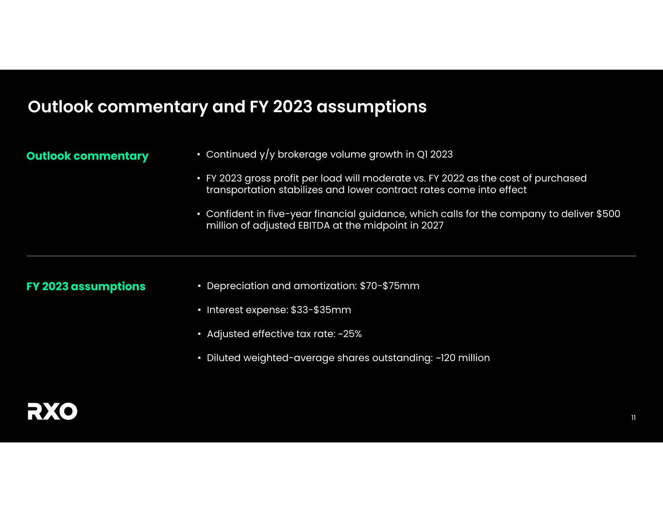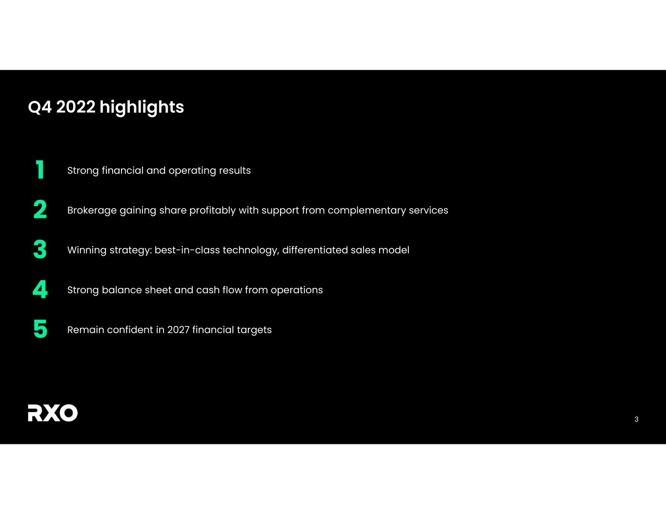 2 Forward-looking statements and Non-GAAP financial measures Forward-looking statements This presentation includes forward-looking statements, including statements relating to our continued year-over-year brokerage volume growth in the first quarter of 2023, our five-year financial targets, and our ability to outperform in any market cycle. All statements other than statements of historical fact are, or may be deemed to be, forward-looking statements. In some cases, forward-looking statements can be identified by the use of forward-looking terms such as "anticipate," "estimate," "believe," "continue," "could," "intend," "may," "plan," "predict," "should," "will," "expect," "project," "forecast," "goal," "outlook," "target,” or the negative of these terms or other comparable terms. However, the absence of these words does not mean that the statements are not forward-looking. These forward-looking statements are based on certain assumptions and analyses made by us in light of our experience and our perception of historical trends, current conditions and expected future developments, as well as other factors we believe are appropriate in the circumstances. These forward-looking statements are subject to known and unknown risks, uncertainties and assumptions that may cause actual results, levels of activity, performance, or achievements to be materially different from any future results, levels of activity, performance or achievements expressed or implied by such forward-looking statements. Factors that might cause or contribute to a material difference include the risks discussed in our filings with the SEC and the following: competition and pricing pressures; economic conditions generally; the severity, magnitude, duration and aftereffects of the COVID-19 pandemic and government responses to the COVID-19 pandemic; fluctuations in fuel prices; increased carrier prices; severe weather, natural disasters, terrorist attacks or similar incidents that cause material disruptions to our operations or the operations of the third-party carriers and independent contractors with which we contract; our dependence on third-party carriers and independent contractors; labor disputes or organizing efforts affecting our workforce and those of our third-party carriers; legal and regulatory challenges to the status of the third-party carriers with which we contract, and their delivery workers, as independent contractors, rather than employees; litigation that may adversely affect our business or reputation; increasingly stringent laws protecting the environment, including transitional risks relating to climate change, that impact our third-party carriers; governmental regulation and political conditions; our ability to develop and implement suitable information technology systems and prevent failures in or breaches of such systems; the impact of potential cyber-attacks and information technology or data security breaches; issues related to our intellectual property rights; our ability to access the capital markets and generate sufficient cash flow to satisfy our debt obligations; our ability to attract and retain qualified personnel; our ability to successfully implement our cost and revenue initiatives and other strategies; our ability to successfully manage our growth; our reliance on certain large customers for a significant portion of our revenue; damage to our reputation through unfavorable publicity; our failure to meet performance levels required by our contracts with our customers; the inability to achieve the level of revenue growth, cash generation, cost savings, improvement in profitability and margins, fiscal discipline, or strengthening of competitiveness and operations anticipated or targeted; a determination by the IRS that the distribution or certain related separation transactions should be treated as taxable transactions; and the impact of the separation on our businesses, operations and results. All forward-looking statements set forth in this presentation are qualified by these cautionary statements and there can be no assurance that the actual results or developments anticipated by us will be realized or, even if substantially realized, that they will have the expected consequences to or effects on us or our business or operations. Forward-looking statements set forth in this presentation speak only as of the date hereof, and we do not undertake any obligation to update forward-looking statements to reflect subsequent events or circumstances, changes in expectations or the occurrence of unanticipated events, except to the extent required by law. Non-GAAP financial measures We provide reconciliations of the non-GAAP financial measures contained in this presentation to the most directly comparable measure under GAAP, which are set forth in the financial tables attached to this presentation. The non-GAAP financial measures in this presentation include: adjusted earnings before interest, taxes, depreciation and amortization (“adjusted EBITDA”); adjusted EBITDA margin; gross margin (revenue less cost of transportation and services (exclusive of depreciation and amortization) and direct operating expense (exclusive of depreciation and amortization)) and gross margin as a percentage of revenue by service offering; and adjusted net income and adjusted diluted earnings per share (“adjusted EPS”); free cash flow; net debt; and net leverage. We believe that these adjusted financial measures facilitate analysis of our ongoing business operations because they exclude items that may not reflect, or are unrelated to, RXO’s core operating performance, and may assist investors with comparisons to prior periods and assessing trends in our underlying businesses. Other companies may calculate these non-GAAP financial measures differently, and therefore our measures may not be comparable to similarly titled measures of other companies. These non-GAAP financial measures should only be used as suppl