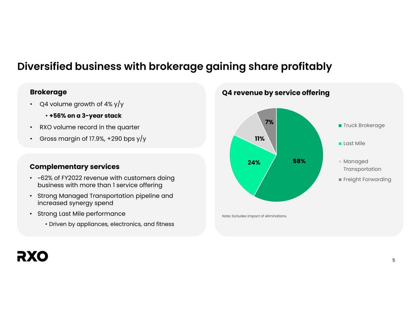 4 Strong fourth-quarter financial and operating results Strong results despite a muted peak season and decline in gross profit per load RXO’s brokerage business continues to outperform and gain profitable market share Adjusted EBITDA and margin %1 $77 M $64 M 5.8% 5.7% 5.4 5.45 5.5 5.55 5.6 5.65 5.7 5.75 5.8 5.85 5.9 $10 $20 $30 $40 $50 $60 $70 $80 Q4 21 Q4 22 Q4 21 Q4 22 Brokerage y/y volume growth 4% $227 M $219 M $170 $180 $190 $200 $210 $220 $230 Q4 21 Q4 22 19.6% 17.1% Gross margin $ and % (1) See the “Non-GAAP financial measures” section