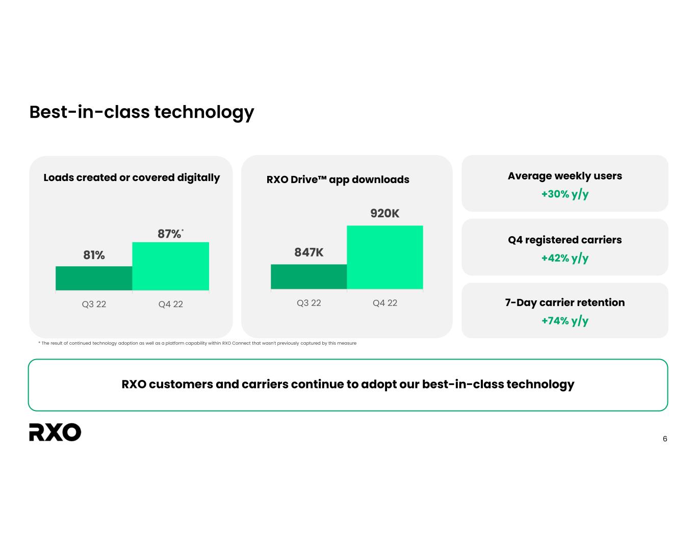 5 Diversified business with brokerage gaining share profitably Q4 revenue by service offeringBrokerage • Q4 volume growth of 4% y/y • +56% on a 3-year stack • RXO volume record in the quarter • Gross margin of 17.9%, +290 bps y/y Complementary services • ~62% of FY2022 revenue with customers doing business with more than 1 service offering • Strong Managed Transportation pipeline and increased synergy spend • Strong Last Mile performance • Driven by appliances, electronics, and fitness 58%24% 11% 7% Truck Brokerage Last Mile Managed Transportation Freight Forwarding Note: Excludes impact of eliminations.