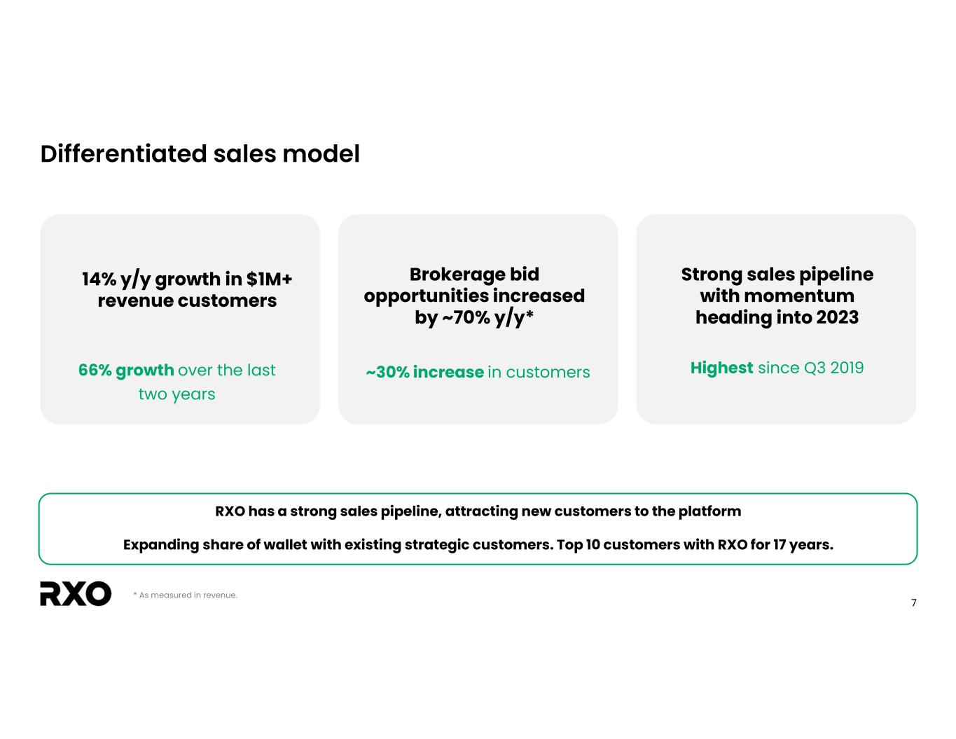 6 Best-in-class technology 81% 87%* Q3 22 Q4 22 847K 920K Q3 22 Q4 22 RXO Drive™ app downloadsLoads created or covered digitally RXO customers and carriers continue to adopt our best-in-class technology * The result of continued technology adoption as well as a platform capability within RXO Connect that wasn’t previously captured by this measure Average weekly users +30% y/y Q4 registered carriers +42% y/y 7-Day carrier retention +74% y/y