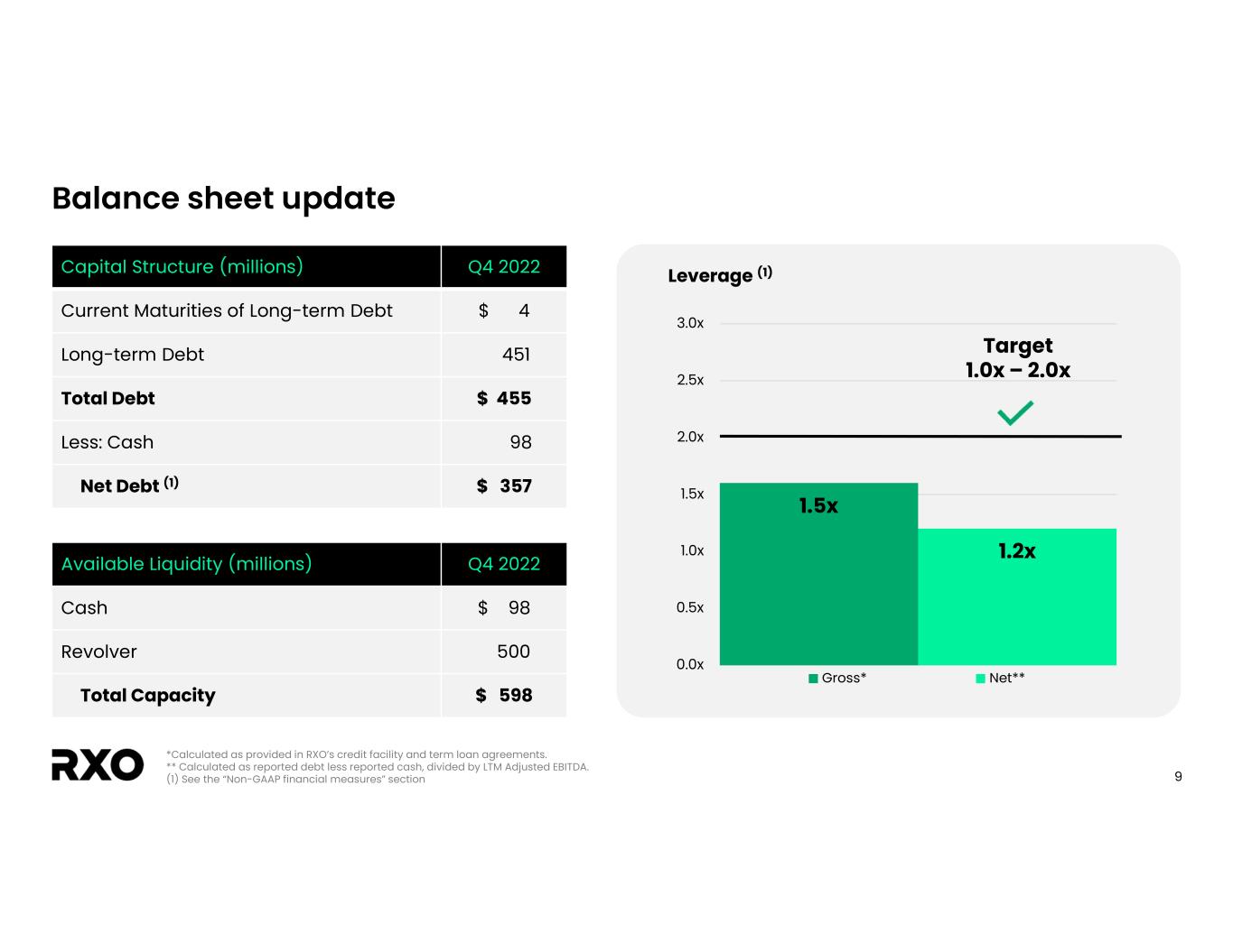 8 Q4 2022 adjusted EPS bridge Earnings Per Share Q4-21 Q4-22 GAAP Diluted EPS $0.36 $( 0.03) Amortization of intangible assets, net of tax 0.04 0.03 Transaction, integration and restructuring costs, net of tax 0.01 0.28 Adjusted Diluted EPS (1) $ 0.41 $ 0.28 RXO delivered adjusted EPS of $0.28 (1) See the “Non-GAAP financial measures” section.