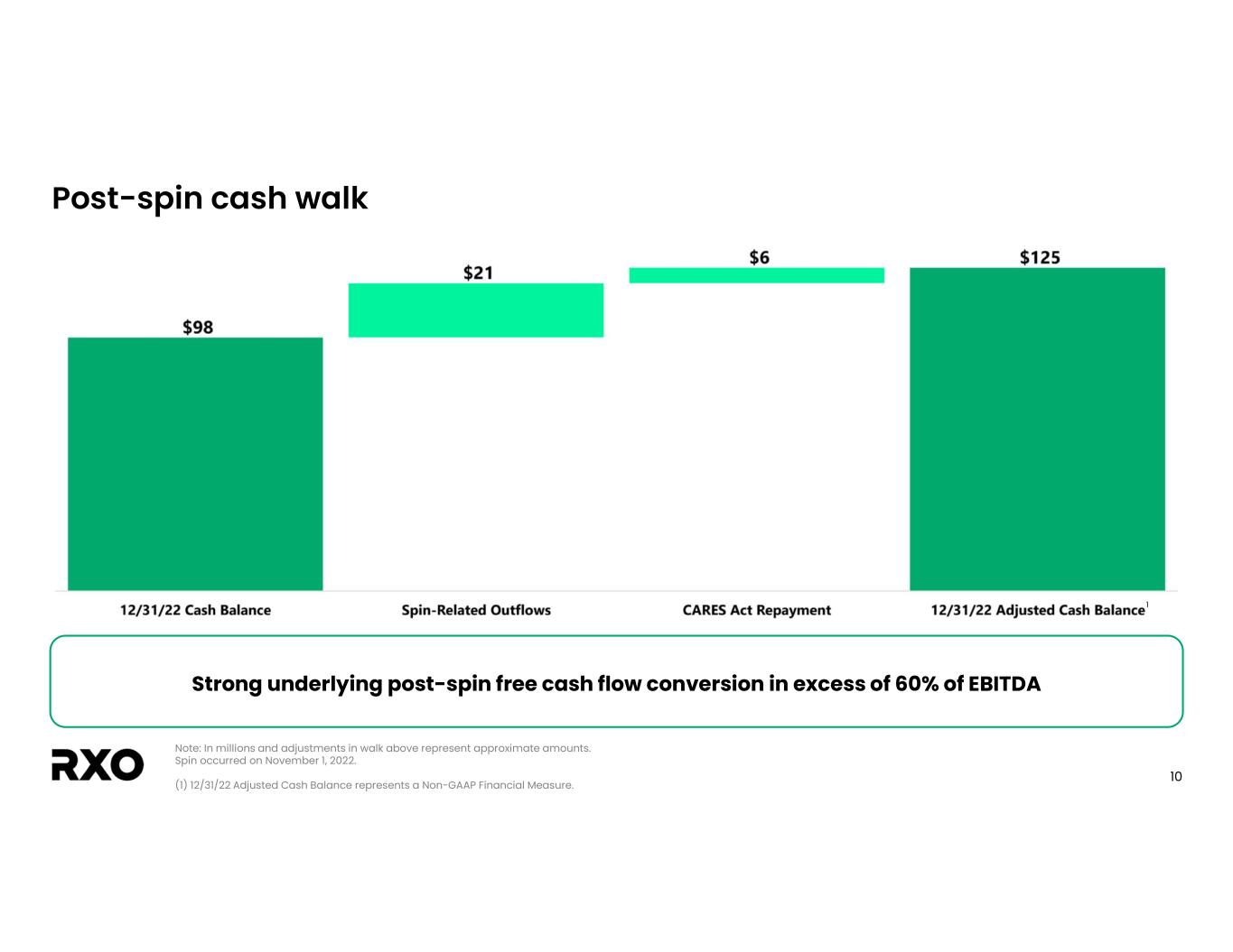 9 Balance sheet update 1.5x 1.2x 0.0x 0.5x 1.0x 1.5x 2.0x 2.5x 3.0x Gross* Net** Capital Structure (millions) Q4 2022 Current Maturities of Long-term Debt $ 4 Long-term Debt 451 Total Debt $ 455 Less: Cash 98 Net Debt (1) $ 357 Available Liquidity (millions) Q4 2022 Cash $ 98 Revolver 500 Total Capacity $ 598 Target 1.0x – 2.0x *Calculated as provided in RXO’s credit facility and term loan agreements. ** Calculated as reported debt less reported cash, divided by LTM Adjusted EBITDA. (1) See the “Non-GAAP financial measures” section Leverage (1)