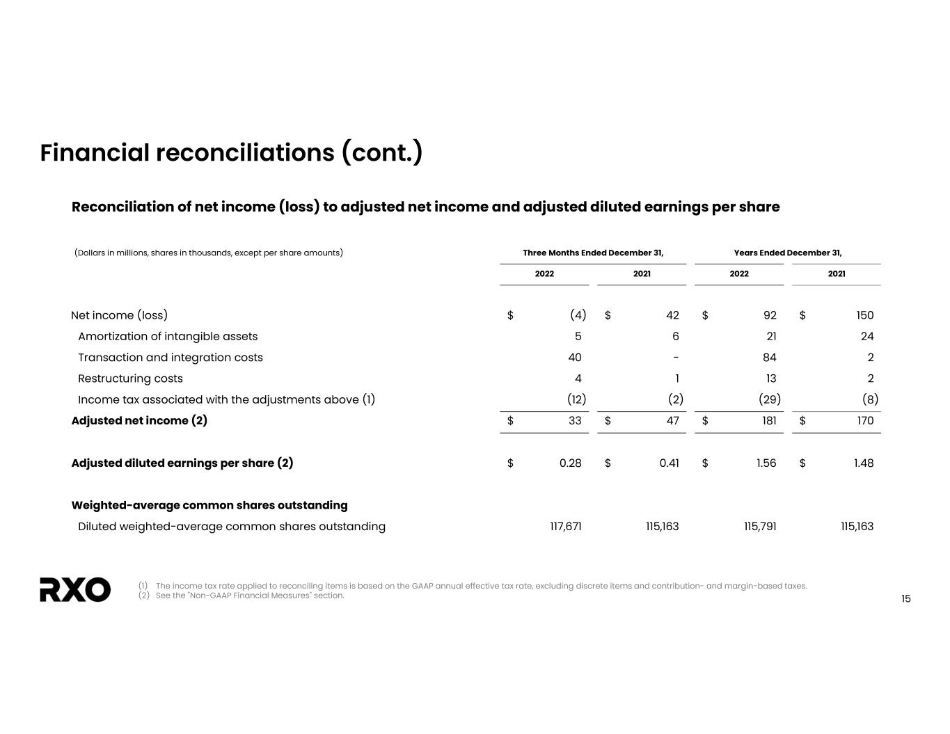 15 Financial reconciliations (cont.) (1) The income tax rate applied to reconciling items is based on the GAAP annual effective tax rate, excluding discrete items and contribution- and margin-based taxes. (2) See the "Non-GAAP Financial Measures" section. Reconciliation of net income (loss) to adjusted net income and adjusted diluted earnings per share (Dollars in millions, shares in thousands, except per share amounts) 2022 2021 2022 2021 Net income (loss) (4)$ 42$ 92$ 150$ Amortization of intangible assets 5 6 21 24 Transaction and integration costs 40 - 84 2 Restructuring costs 4 1 13 2 Income tax associated with the adjustments above (1) (12) (2) (29) (8) Adjusted net income (2) 33$ 47$ 181$ 170$ Adjusted diluted earnings per share (2) 0.28$ 0.41$ 1.56$ 1.48$ Weighted-average common shares outstanding Diluted weighted-average common shares outstanding 117,671 115,163 115,791 115,163 Years Ended December 31,Three Months Ended December 31,