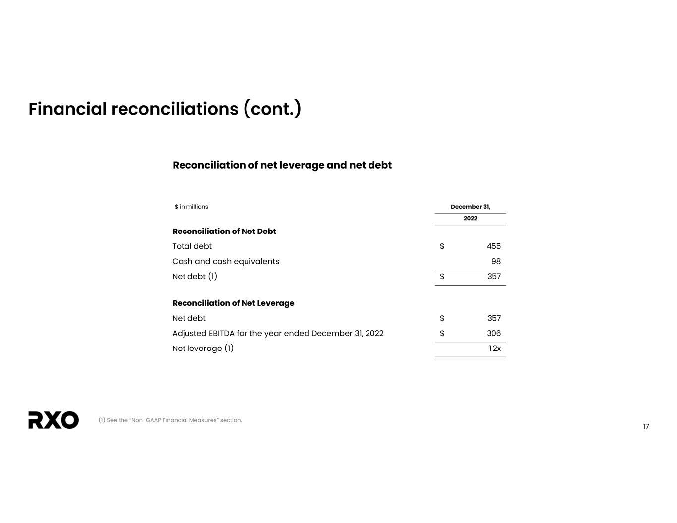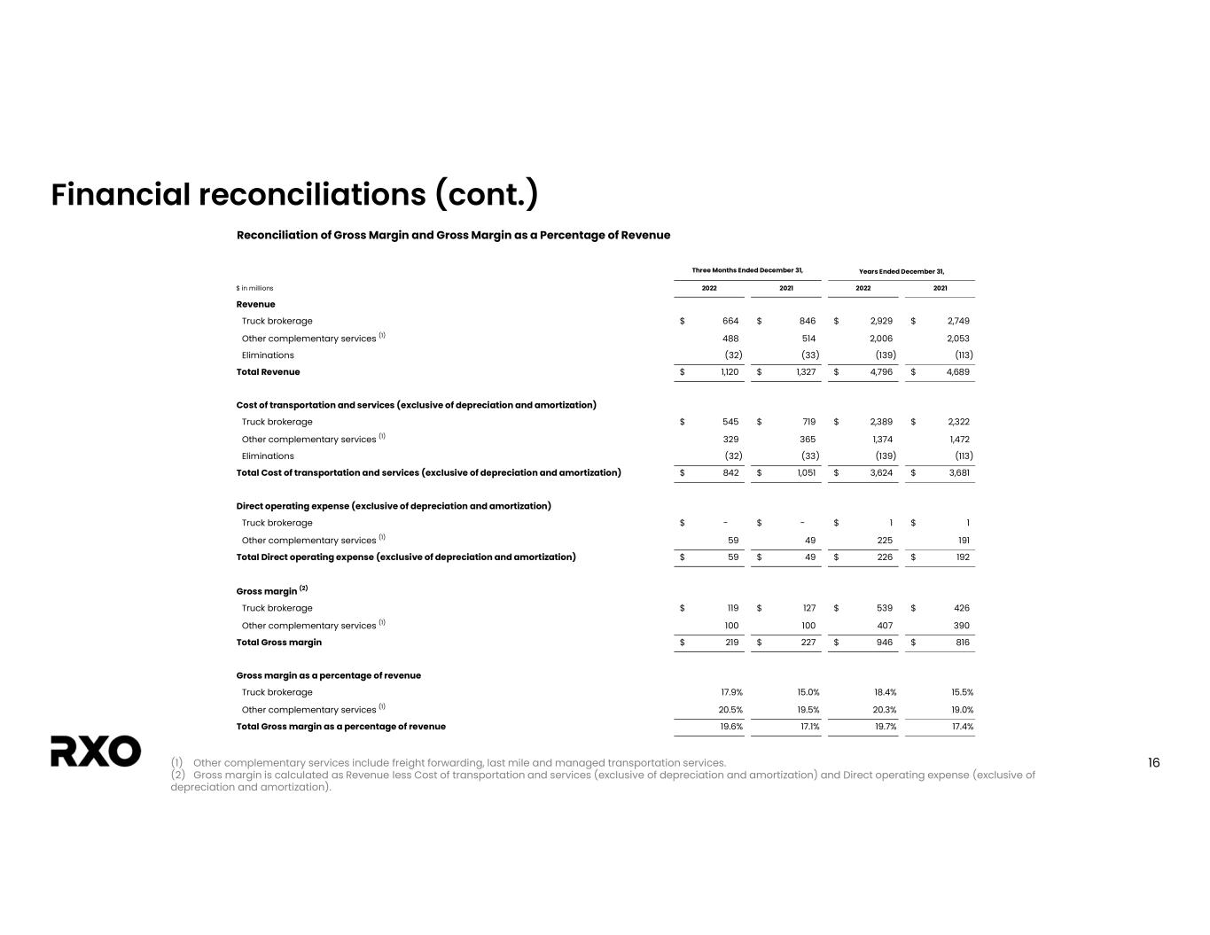 16 Financial reconciliations (cont.) (1) Other complementary services include freight forwarding, last mile and managed transportation services. (2) Gross margin is calculated as Revenue less Cost of transportation and services (exclusive of depreciation and amortization) and Direct operating expense (exclusive of depreciation and amortization). $ in millions 2022 2021 2022 2021 Revenue Truck brokerage 664$ 846$ 2,929$ 2,749$ Other complementary services (1) 488 514 2,006 2,053 Eliminations (32) (33) (139) (113) Total Revenue 1,120$ 1,327$ 4,796$ 4,689$ Cost of transportation and services (exclusive of depreciation and amortization) Truck brokerage 545$ 719$ 2,389$ 2,322$ Other complementary services (1) 329 365 1,374 1,472 Eliminations (32) (33) (139) (113) Total Cost of transportation and services (exclusive of depreciation and amortization) 842$ 1,051$ 3,624$ 3,681$ Direct operating expense (exclusive of depreciation and amortization) Truck brokerage -$ -$ 1$ 1$ Other complementary services (1) 59 49 225 191 Total Direct operating expense (exclusive of depreciation and amortization) 59$ 49$ 226$ 192$ Gross margin (2) Truck brokerage 119$ 127$ 539$ 426$ Other complementary services (1) 100 100 407 390 Total Gross margin 219$ 227$ 946$ 816$ Gross margin as a percentage of revenue Truck brokerage 17.9% 15.0% 18.4% 15.5% Other complementary services (1) 20.5% 19.5% 20.3% 19.0% Total Gross margin as a percentage of revenue 19.6% 17.1% 19.7% 17.4% Reconciliation of Gross Margin and Gross Margin as a Percentage of Revenue Three Months Ended December 31, Years Ended December 31,