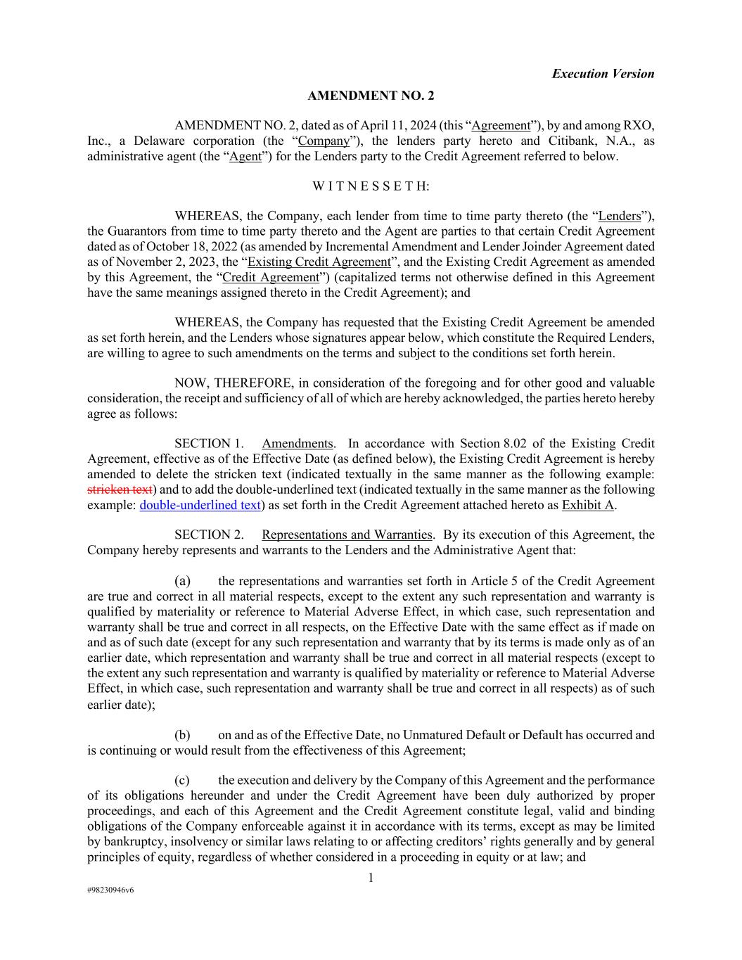 Execution Version 1 #98230946v6 AMENDMENT NO. 2 AMENDMENT NO. 2, dated as of April 11, 2024 (this “Agreement”), by and among RXO, Inc., a Delaware corporation (the “Company”), the lenders party hereto and Citibank, N.A., as administrative agent (the “Agent”) for the Lenders party to the Credit Agreement referred to below. W I T N E S S E T H: WHEREAS, the Company, each lender from time to time party thereto (the “Lenders”), the Guarantors from time to time party thereto and the Agent are parties to that certain Credit Agreement dated as of October 18, 2022 (as amended by Incremental Amendment and Lender Joinder Agreement dated as of November 2, 2023, the “Existing Credit Agreement”, and the Existing Credit Agreement as amended by this Agreement, the “Credit Agreement”) (capitalized terms not otherwise defined in this Agreement have the same meanings assigned thereto in the Credit Agreement); and WHEREAS, the Company has requested that the Existing Credit Agreement be amended as set forth herein, and the Lenders whose signatures appear below, which constitute the Required Lenders, are willing to agree to such amendments on the terms and subject to the conditions set forth herein. NOW, THEREFORE, in consideration of the foregoing and for other good and valuable consideration, the receipt and sufficiency of all of which are hereby acknowledged, the parties hereto hereby agree as follows: SECTION 1. Amendments. In accordance with Section 8.02 of the Existing Credit Agreement, effective as of the Effective Date (as defined below), the Existing Credit Agreement is hereby amended to delete the stricken text (indicated textually in the same manner as the following example: stricken text) and to add the double-underlined text (indicated textually in the same manner as the following example: double-underlined text) as set forth in the Credit Agreement attached hereto as Exhibit A. SECTION 2. Representations and Warranties. By its execution of this Agreement, the Company hereby represents and warrants to the Lenders and the Administrative Agent that: (a) the representations and warranties set forth in Article 5 of the Credit Agreement are true and correct in all material respects, except to the extent any such representation and warranty is qualified by materiality or reference to Material Adverse Effect, in which case, such representation and warranty shall be true and correct in all respects, on the Effective Date with the same effect as if made on and as of such date (except for any such representation and warranty that by its terms is made only as of an earlier date, which representation and warranty shall be true and correct in all material respects (except to the extent any such representation and warranty is qualified by materiality or reference to Material Adverse Effect, in which case, such representation and warranty shall be true and correct in all respects) as of such earlier date); (b) on and as of the Effective Date, no Unmatured Default or Default has occurred and is continuing or would result from the effectiveness of this Agreement; (c) the execution and delivery by the Company of this Agreement and the performance of its obligations hereunder and under the Credit Agreement have been duly authorized by proper proceedings, and each of this Agreement and the Credit Agreement constitute legal, valid and binding obligations of the Company enforceable against it in accordance with its terms, except as may be limited by bankruptcy, insolvency or similar laws relating to or affecting creditors’ rights generally and by general principles of equity, regardless of whether considered in a proceeding in equity or at law; and