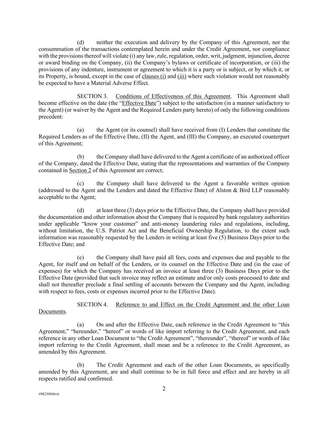 2 #98230946v6 (d) neither the execution and delivery by the Company of this Agreement, nor the consummation of the transactions contemplated herein and under the Credit Agreement, nor compliance with the provisions thereof will violate (i) any law, rule, regulation, order, writ, judgment, injunction, decree or award binding on the Company, (ii) the Company’s bylaws or certificate of incorporation, or (iii) the provisions of any indenture, instrument or agreement to which it is a party or is subject, or by which it, or its Property, is bound, except in the case of clauses (i) and (iii) where such violation would not reasonably be expected to have a Material Adverse Effect. SECTION 3. Conditions of Effectiveness of this Agreement. This Agreement shall become effective on the date (the “Effective Date”) subject to the satisfaction (in a manner satisfactory to the Agent) (or waiver by the Agent and the Required Lenders party hereto) of only the following conditions precedent: (a) the Agent (or its counsel) shall have received from (I) Lenders that constitute the Required Lenders as of the Effective Date, (II) the Agent, and (III) the Company, an executed counterpart of this Agreement; (b) the Company shall have delivered to the Agent a certificate of an authorized officer of the Company, dated the Effective Date, stating that the representations and warranties of the Company contained in Section 2 of this Agreement are correct; (c) the Company shall have delivered to the Agent a favorable written opinion (addressed to the Agent and the Lenders and dated the Effective Date) of Alston & Bird LLP reasonably acceptable to the Agent; (d) at least three (3) days prior to the Effective Date, the Company shall have provided the documentation and other information about the Company that is required by bank regulatory authorities under applicable “know your customer” and anti-money laundering rules and regulations, including, without limitation, the U.S. Patriot Act and the Beneficial Ownership Regulation, to the extent such information was reasonably requested by the Lenders in writing at least five (5) Business Days prior to the Effective Date; and (e) the Company shall have paid all fees, costs and expenses due and payable to the Agent, for itself and on behalf of the Lenders, or its counsel on the Effective Date and (in the case of expenses) for which the Company has received an invoice at least three (3) Business Days prior to the Effective Date (provided that such invoice may reflect an estimate and/or only costs processed to date and shall not thereafter preclude a final settling of accounts between the Company and the Agent, including with respect to fees, costs or expenses incurred prior to the Effective Date). SECTION 4. Reference to and Effect on the Credit Agreement and the other Loan Documents. (a) On and after the Effective Date, each reference in the Credit Agreement to “this Agreement,” “hereunder,” “hereof” or words of like import referring to the Credit Agreement, and each reference in any other Loan Document to “the Credit Agreement”, “thereunder”, “thereof” or words of like import referring to the Credit Agreement, shall mean and be a reference to the Credit Agreement, as amended by this Agreement. (b) The Credit Agreement and each of the other Loan Documents, as specifically amended by this Agreement, are and shall continue to be in full force and effect and are hereby in all respects ratified and confirmed.