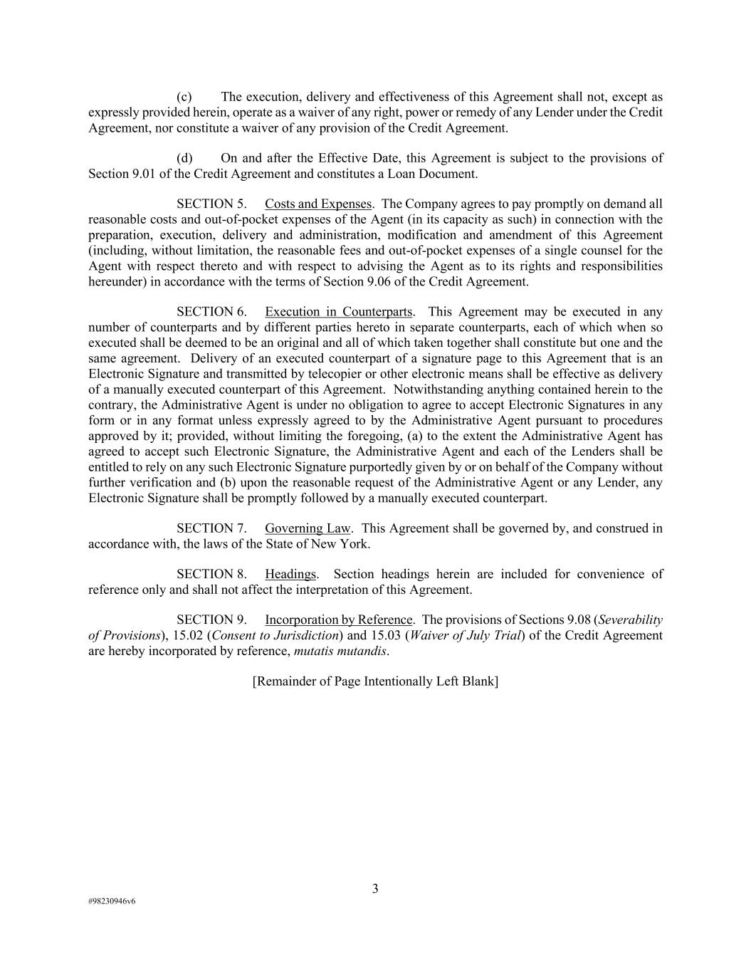 3 #98230946v6 (c) The execution, delivery and effectiveness of this Agreement shall not, except as expressly provided herein, operate as a waiver of any right, power or remedy of any Lender under the Credit Agreement, nor constitute a waiver of any provision of the Credit Agreement. (d) On and after the Effective Date, this Agreement is subject to the provisions of Section 9.01 of the Credit Agreement and constitutes a Loan Document. SECTION 5. Costs and Expenses. The Company agrees to pay promptly on demand all reasonable costs and out-of-pocket expenses of the Agent (in its capacity as such) in connection with the preparation, execution, delivery and administration, modification and amendment of this Agreement (including, without limitation, the reasonable fees and out-of-pocket expenses of a single counsel for the Agent with respect thereto and with respect to advising the Agent as to its rights and responsibilities hereunder) in accordance with the terms of Section 9.06 of the Credit Agreement. SECTION 6. Execution in Counterparts. This Agreement may be executed in any number of counterparts and by different parties hereto in separate counterparts, each of which when so executed shall be deemed to be an original and all of which taken together shall constitute but one and the same agreement. Delivery of an executed counterpart of a signature page to this Agreement that is an Electronic Signature and transmitted by telecopier or other electronic means shall be effective as delivery of a manually executed counterpart of this Agreement. Notwithstanding anything contained herein to the contrary, the Administrative Agent is under no obligation to agree to accept Electronic Signatures in any form or in any format unless expressly agreed to by the Administrative Agent pursuant to procedures approved by it; provided, without limiting the foregoing, (a) to the extent the Administrative Agent has agreed to accept such Electronic Signature, the Administrative Agent and each of the Lenders shall be entitled to rely on any such Electronic Signature purportedly given by or on behalf of the Company without further verification and (b) upon the reasonable request of the Administrative Agent or any Lender, any Electronic Signature shall be promptly followed by a manually executed counterpart. SECTION 7. Governing Law. This Agreement shall be governed by, and construed in accordance with, the laws of the State of New York. SECTION 8. Headings. Section headings herein are included for convenience of reference only and shall not affect the interpretation of this Agreement. SECTION 9. Incorporation by Reference. The provisions of Sections 9.08 (Severability of Provisions), 15.02 (Consent to Jurisdiction) and 15.03 (Waiver of July Trial) of the Credit Agreement are hereby incorporated by reference, mutatis mutandis. [Remainder of Page Intentionally Left Blank]